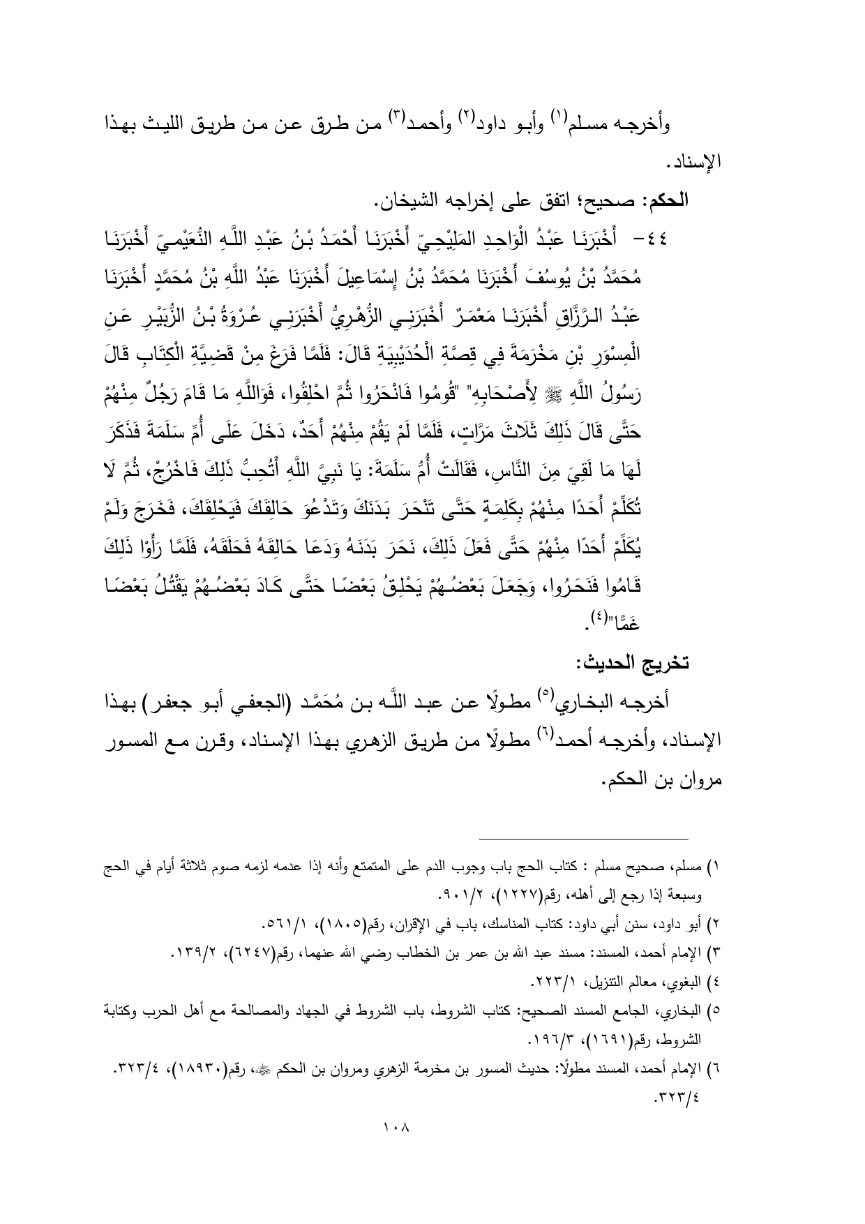 أخرجه البخاري (¬5) مطولًا عن عبد اللَّه بن مُحَمَّد (الجعفي أبو جعفر) بهذا الإسناد، وأخرجه أحمد (¬6) مطولًا من طريق الزهري بهذا الإسناد، وقرن مع المسور مروان بن الحكم.