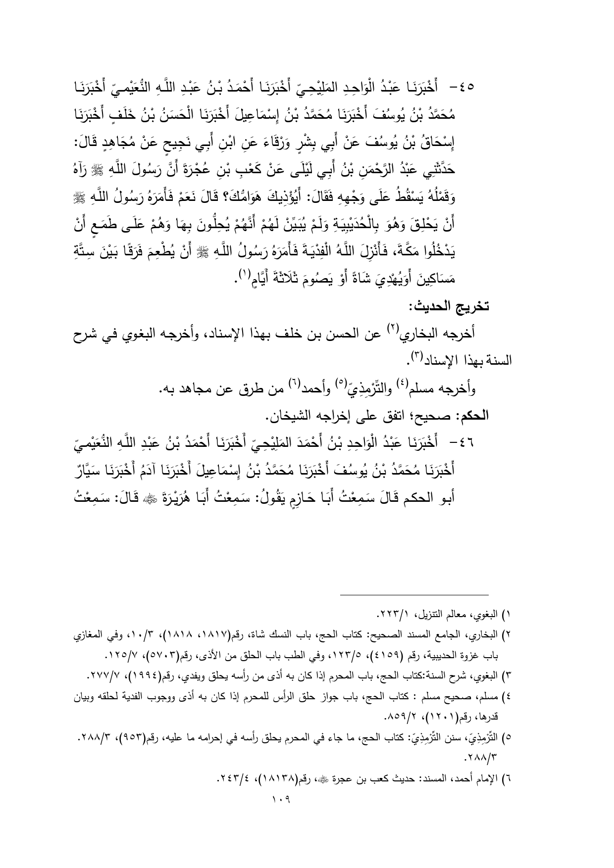 45 - أَخْبَرَنَا عَبْدُ الْوَاحِدِ المَلِيْحِيّ أَخْبَرَنَا أَحْمَدُ بْنُ عَبْدِ اللَّهِ النُّعَيْميّ أَخْبَرَنَا مُحَمَّدُ بْنُ يُوسُفَ أَخْبَرَنَا مُحَمَّدُ بْنُ إِسْمَاعِيلَ أَخْبَرَنَا الْحَسَنُ بْنُ خَلَفٍ أَخْبَرَنَا إِسْحَاقُ بْنُ يُوسُفَ عَنْ أَبِي بِشْرٍ وَرْقَاءَ عَنِ ابْنِ أَبِي نَجِيحٍ عَنْ مُجَاهِدٍ قَالَ: حَدَّثَنِي عَبْدُ الرَّحْمَنِ بْنُ أَبِي لَيْلَى عَنْ كَعْبِ بْنِ عُجْرَةَ أَنَّ رَسُولَ اللَّهِ - صلى الله عليه وسلم - رَآهُ وَقَمْلُهُ يَسْقُطُ عَلَى وَجْهِهِ فَقَالَ: أَيُؤْذِيكَ هَوَامُّكَ؟ قَالَ نَعَمْ فَأَمَرَهُ رَسُولُ اللَّهِ - صلى الله عليه وسلم - أَنْ يَحْلِقَ وَهُوَ بِالْحُدَيْبِيَةِ وَلَمْ يُبَيِّنْ لَهُمْ أَنَّهُمْ يُحِلُّونَ بِهَا وَهُمْ عَلَى طَمَعٍ أَنْ يَدْخُلُوا مَكَّةَ، فَأَنْزِلَ اللَّهُ الْفِدْيَةَ فَأَمَرَهُ رَسُولُ اللَّهِ - صلى الله عليه وسلم - أَنْ يُطْعِمَ فَرَقًا بَيْنَ سِتَّةِ مَسَاكِينَ أَوَيُهْدِيَ شَاةً أَوْ يَصُومَ ثَلَاثَةَ أَيَّامٍ (¬1).