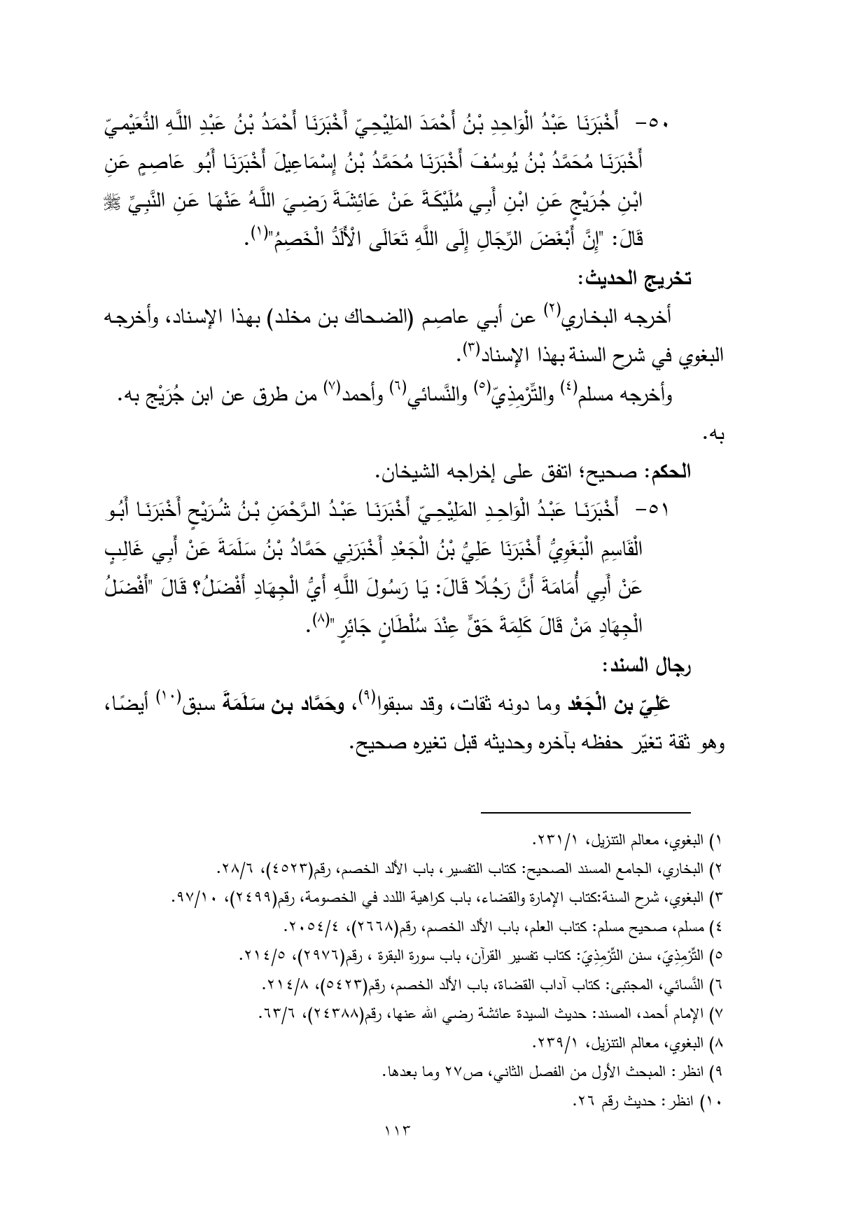 (¬3) البغوي، شرح السنة: كتاب الإمارة والقضاء، باب كراهية اللدد في الخصومة، رقم (2499)، 10/ 97.