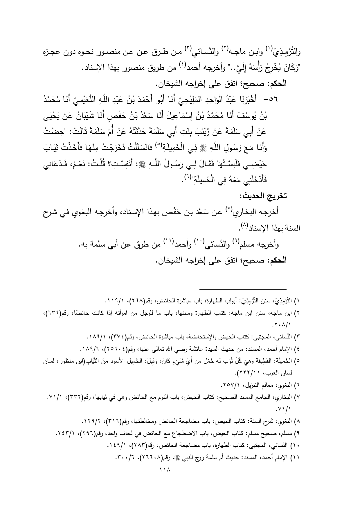 56 - أَخْبَرَنَا عَبْدُ الْوَاحِدِ المَلِيْحِيّ أَنَا أَبُو أَحْمَدَ بْنُ عَبْدِ اللَّهِ النُّعَيْميّ أَنَا مُحَمَّدُ بْنُ يُوسُفَ أَنَا مُحَمَّدُ بْنُ إِسْمَاعِيلَ أَنَا سَعْدُ بْنُ حَفْصٍ أَنَا شَيْبَانُ عَنْ يَحْيَى عَنْ أَبِي سَلَمَةَ عَنْ زَيْنَبَ بِنْتِ أَبِي سَلَمَةَ حَدَّثَتْهُ عَنْ أُمِّ سَلَمَةَ قَالَتْ: "حِضْتُ وَأَنَا مَعَ رَسُولِ اللَّهِ - صلى الله عليه وسلم - فِي الْخَمِيلَةِ (¬5) فَانْسَلَلْتُ فَخَرَجْتُ مِنْهَا فَأَخَذْتُ ثِيَابَ حَيْضِي فَلَبِسْتُهَا فَقَالَ لِي رَسُولُ اللَّهِ - صلى الله عليه وسلم -: أَنَفِسْتِ؟ قُلْتُ: نَعَمْ، فَدَعَانِي فَأَدْخَلَنِي مَعَهُ فِي الْخَمِيلَةِ" (¬6).