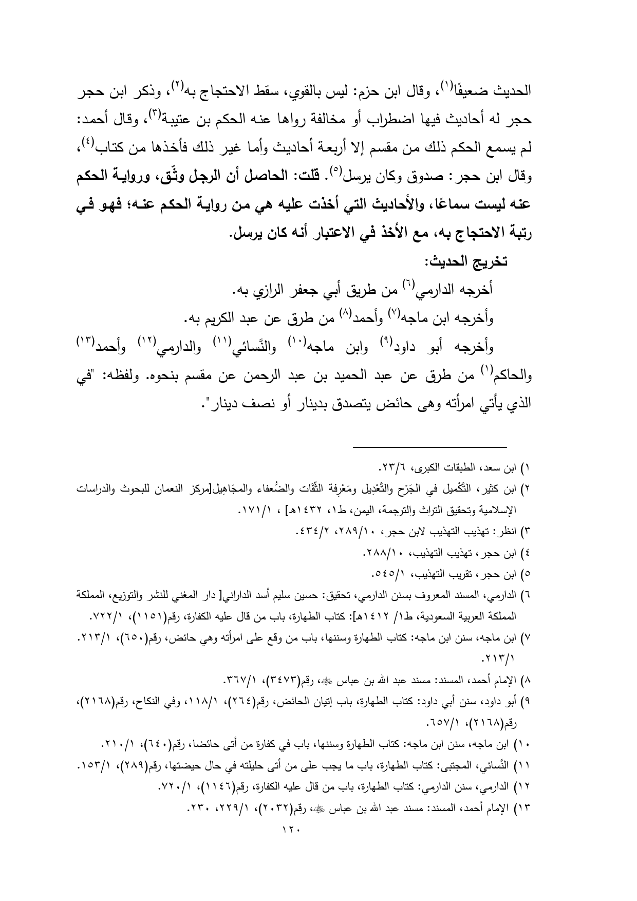 (¬10) ابن ماجه، سنن ابن ماجه: كتاب الطهارة وسننها، باب في كفارة من أتى حائضا، رقم (640)، 1/ 210.