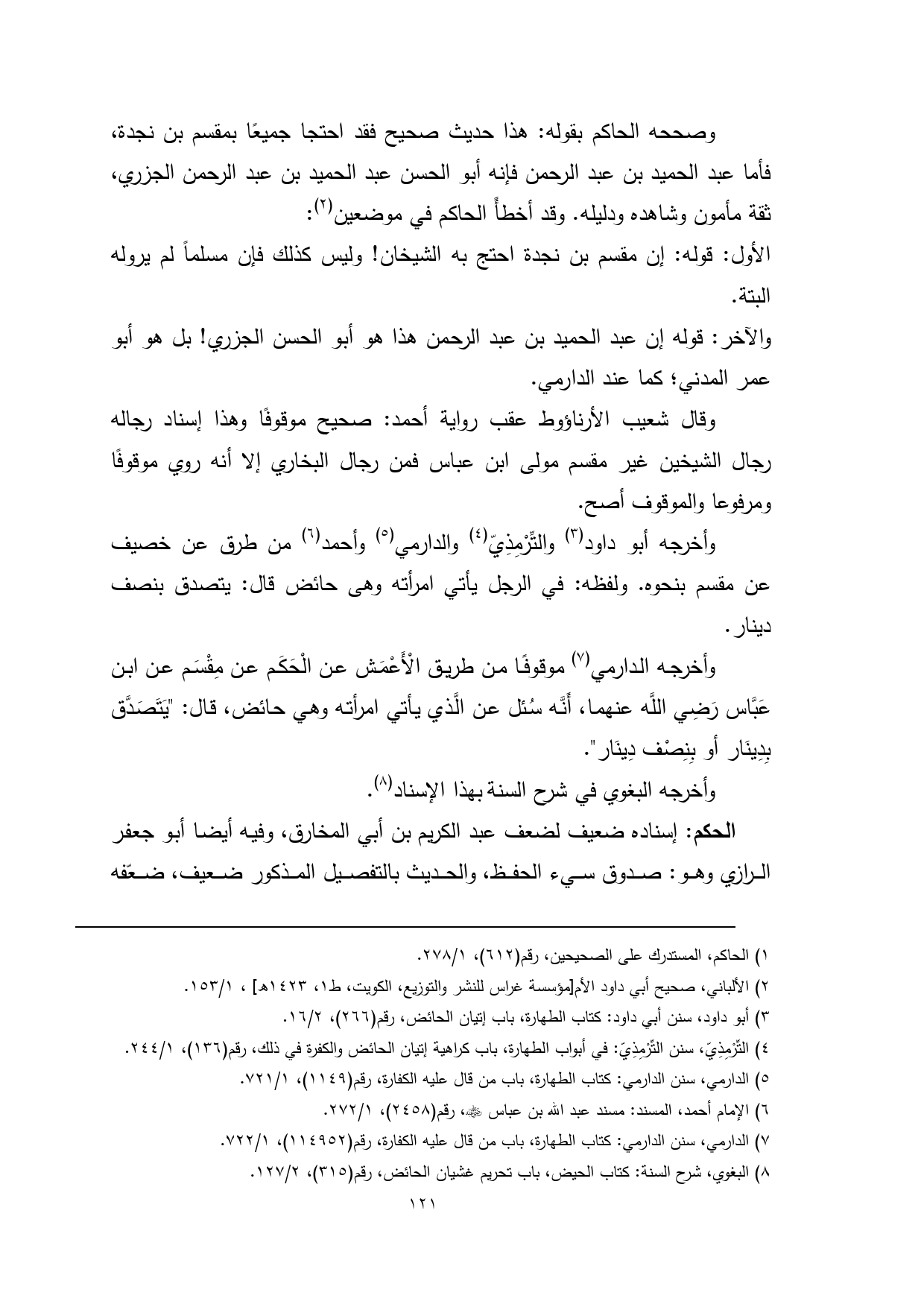وصححه الحاكم بقوله: هذا حديث صحيح فقد احتجا جميعًا بمقسم بن نجدة، فأما عبد الحميد بن عبد الرحمن فإنه أبو الحسن عبد الحميد بن عبد الرحمن الجزري، ثقة مأمون وشاهده ودليله. وقد أخطأً الحاكم في موضعين (¬1):