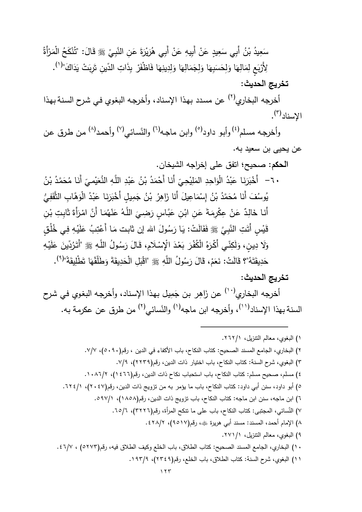 (¬11) البغوي، شرح السنة: كتاب الطلاق، باب الخلع، رقم (2349)، 9/ 193.