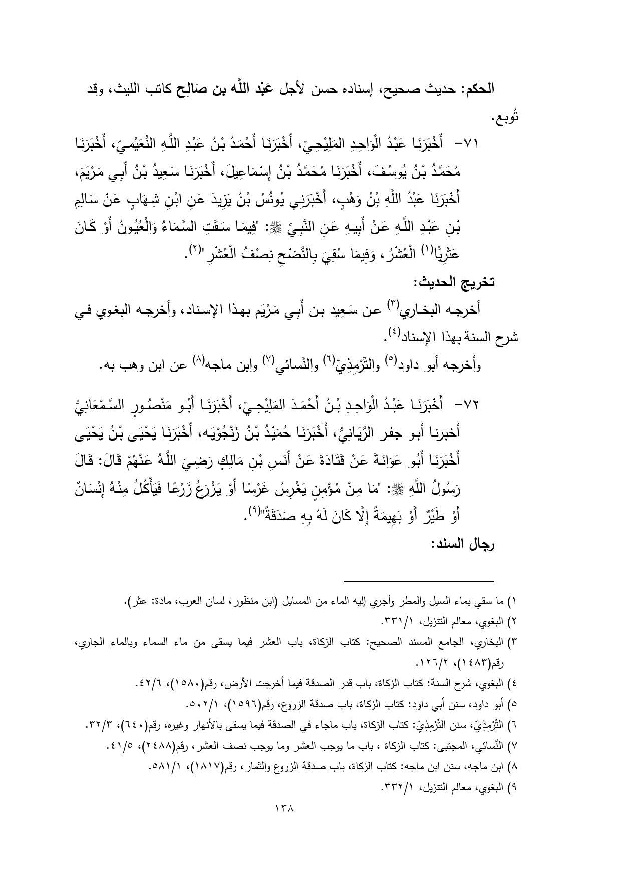 71 - أَخْبَرَنَا عَبْدُ الْوَاحِدِ المَلِيْحِيّ، أَخْبَرَنَا أَحْمَدُ بْنُ عَبْدِ اللَّهِ النُّعَيْميّ، أَخْبَرَنَا مُحَمَّدُ بْنُ يُوسُفَ، أَخْبَرَنَا مُحَمَّدُ بْنُ إِسْمَاعِيلَ، أَخْبَرَنَا سَعِيدُ بْنُ أَبِي مَرْيَمَ، أَخْبَرَنَا عَبْدُ اللَّهِ بْنُ وَهْبٍ، أَخْبَرَنِي يُونُسُ بْنُ يَزِيدَ عَنِ ابْنِ شِهَابٍ عَنْ سَالِمِ بْنِ عَبْدِ اللَّهِ عَنْ أَبِيهِ عَنِ النَّبِيِّ - صلى الله عليه وسلم -: "فِيمَا سَقَتِ السَّمَاءُ وَالْعُيُونُ أَوْ كَانَ عَثَرِيًّا (¬1) الْعُشْرُ، وَفِيمَا سُقِيَ بِالنَّضْحِ نِصْفُ الْعُشْرِ" (¬2).