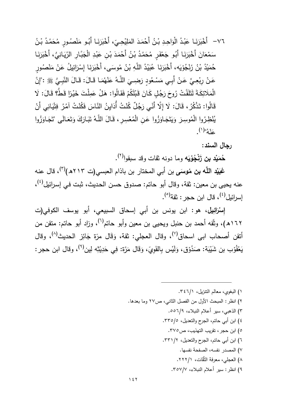 76 - أَخْبَرَنَا عَبْدُ الْوَاحِدِ بْنُ أَحْمَدَ المَلِيْحِيّ، أَخْبَرَنَا أَبُو مَنْصُورٍ مُحَمَّدُ بْنُ سَمْعَانَ أَخْبَرَنَا أَبُو جَعْفَرٍ مُحَمَّدُ بْنُ أَحْمَدَ بْنِ عَبْدِ الْجَبَّارِ الرَّيَانِيُّ، أَخْبَرَنَا حُمَيْدُ بْنُ زَنْجُوْيَه، أَخْبَرَنَا عُبَيْدُ اللَّهِ بْنُ مُوسَى، أَخْبَرَنَا إِسْرَائِيلُ عَنْ مَنْصُورٍ عَنْ رِبْعِيٍّ عَنْ أَبِي مَسْعُودٍ رَضِيَ اللَّهُ عَنْهُمَا قَالَ: قَالَ النَّبِيُّ - صلى الله عليه وسلم -: "إِنَّ الْمَلَائِكَةَ لَتَلَقَّتْ رُوحَ رَجُلٍ كَانَ قَبْلَكُمْ فَقَالُوا: هَلْ عَمِلْتَ خَيْرًا قَطُّ؟ قَالَ: لَا قَالُوا: تَذْكُرُ، قَالَ: لَا إِلَّا أَنِّي رَجُلٌ كُنْتُ أُدَايِنُ النَّاسَ فَكُنْتُ آمُرُ فِتْيَانِي أَنْ يُنْظِرُوا الْمُوسِرَ وَيَتَجَاوَزُوا عَنِ الْمُعْسِرِ، قَالَ اللَّهُ تَبَارَكَ وَتَعَالَى "تَجَاوَزُوا عَنْهُ" (¬1).