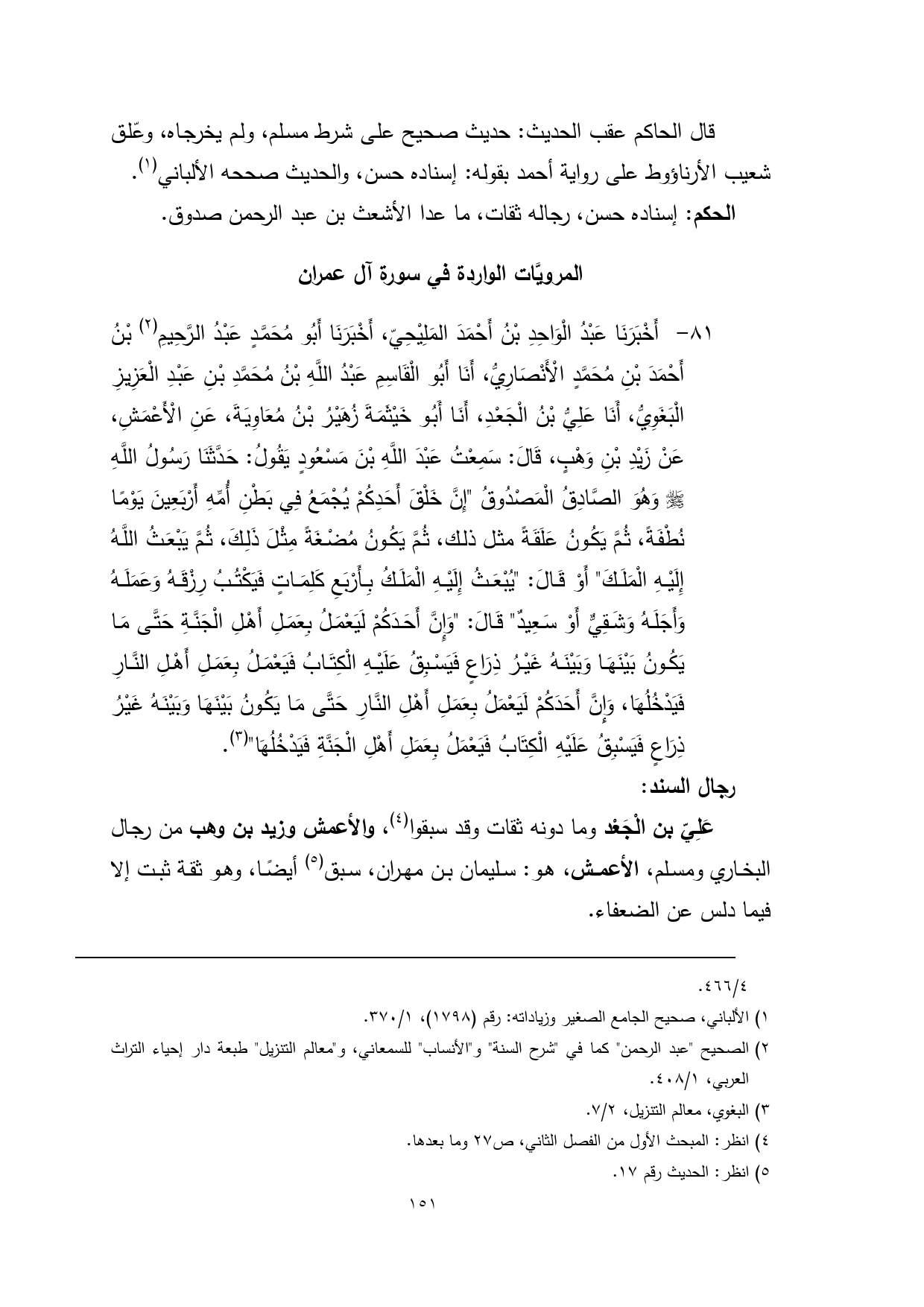 81 - أَخْبَرَنَا عَبْدُ الْوَاحِدِ بْنُ أَحْمَدَ المَلِيْحِيّ، أَخْبَرَنَا أَبُو مُحَمَّدٍ عَبْدُ الرَّحِيمِ (¬2) بْنُ أَحْمَدَ بْنِ مُحَمَّدٍ الْأَنْصَارِيُّ، أَنَا أَبُو الْقَاسِمِ عَبْدُ اللَّهِ بْنُ مُحَمَّدِ بْنِ عَبْدِ الْعَزِيزِ الْبَغَوِيُّ، أَنَا عَلِيُّ بْنُ الْجَعْدِ، أَنَا أَبُو خَيْثَمَةَ زُهَيْرُ بْنُ مُعَاوِيَةَ، عَنِ الْأَعْمَشِ، عَنْ زَيْدِ بْنِ وَهْبٍ، قَالَ: سَمِعْتُ عَبْدَ اللَّهِ بْنَ مَسْعُودٍ يَقُولُ: حَدَّثَنَا رَسُولُ اللَّهِ - صلى الله عليه وسلم - وَهُوَ الصَّادِقُ الْمَصْدُوقُ "إِنَّ خَلْقَ أَحَدِكُمْ يُجْمَعُ فِي بَطْنِ أُمِّهِ أَرْبَعِينَ يَوْمًا نُطْفَةً، ثُمَّ يَكُونُ عَلَقَةً مثل ذلك، ثُمَّ يَكُونُ مُضْغَةً مِثْلَ ذَلِكَ، ثُمَّ يَبْعَثُ اللَّهُ إِلَيْهِ الْمَلَكَ" أَوْ قَالَ: "يُبْعَثُ إِلَيْهِ الْمَلَكُ بِأَرْبَعِ كَلِمَاتٍ فَيَكْتُبُ رِزْقَهُ وَعَمَلَهُ وَأَجَلَهُ وَشَقِيٌّ أَوْ سَعِيدٌ" قَالَ: "وَإِنَّ أَحَدَكُمْ لَيَعْمَلُ بِعَمَلِ أَهْلِ الْجَنَّةِ حَتَّى مَا يَكُونُ بَيْنَهَا وَبَيْنَهُ غَيْرُ ذِرَاعٍ فَيَسْبِقُ عَلَيْهِ الْكِتَابُ فَيَعْمَلُ بِعَمَلِ أَهْلِ النَّارِ فَيَدْخُلُهَا، وَإِنَّ أَحَدَكُمْ لَيَعْمَلُ بِعَمَلِ أَهْلِ النَّارِ حَتَّى مَا يَكُونُ بَيْنَهَا وَبَيْنَهُ غَيْرُ ذِرَاعٍ فَيَسْبِقُ عَلَيْهِ الْكِتَابُ فَيَعْمَلُ بِعَمَلِ أَهْلِ الْجَنَّةِ فَيَدْخُلُهَا" (¬3).