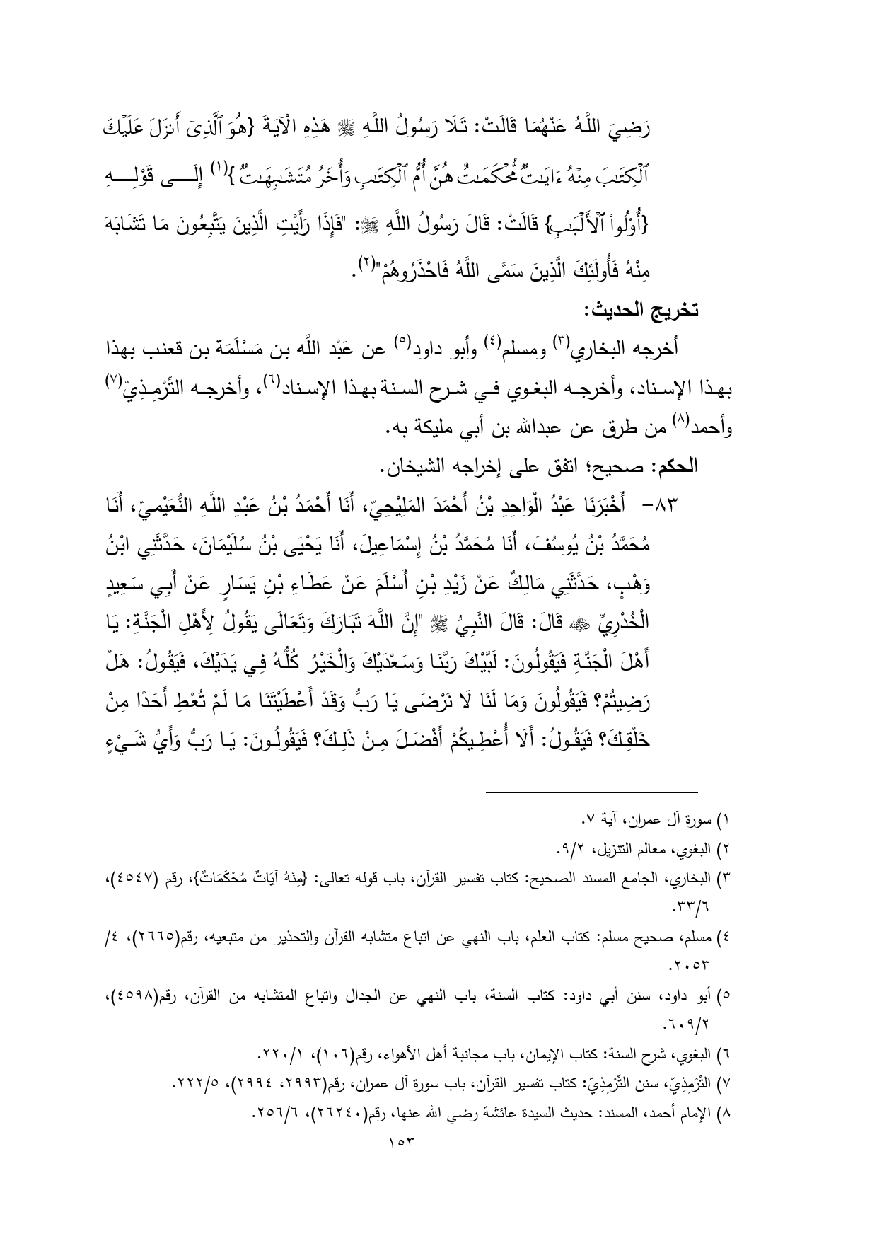 (¬4) مسلم، صحيح مسلم: كتاب العلم، باب النهي عن اتباع متشابه القرآن والتحذير من متبعيه، رقم (2665)، 4/ 2053.