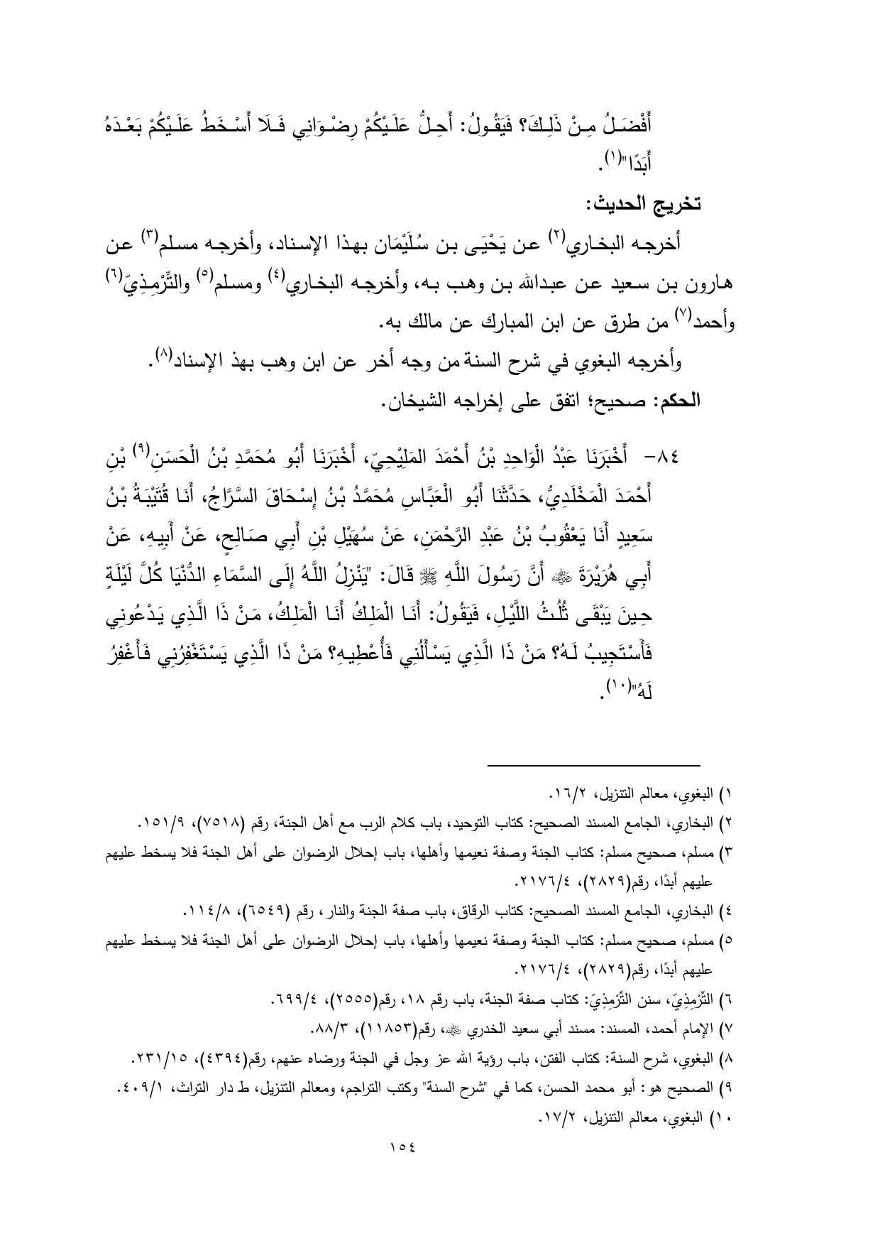 (¬8) البغوي، شرح السنة: كتاب الفتن، باب رؤية الله عز وجل في الجنة ورضاه عنهم، رقم (4394)، 15/ 231.