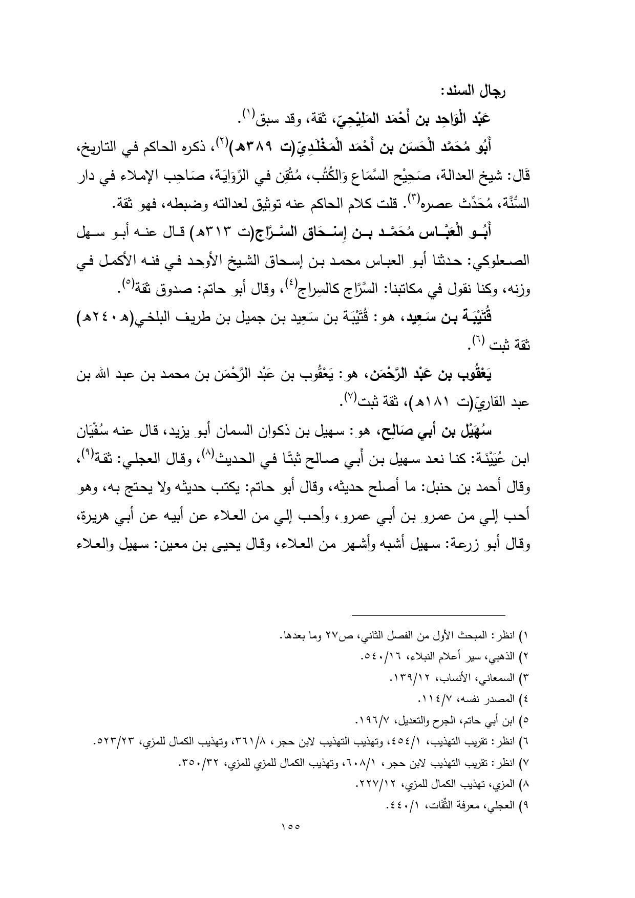 أَبُو الْعَبَّاس مُحَمَّد بن إِسْحَاق السَّرَّاج (ت 313 هـ) قال عنه أبو سهل الصعلوكي: حدثنا أبو العباس محمد بن إسحاق الشيخ الأوحد في فنه الأكمل في وزنه، وكنا نقول في مكاتبنا: السَّرَّاج كالسِراج (¬4)، وقال أبو حاتم: صدوق ثقة (¬5).