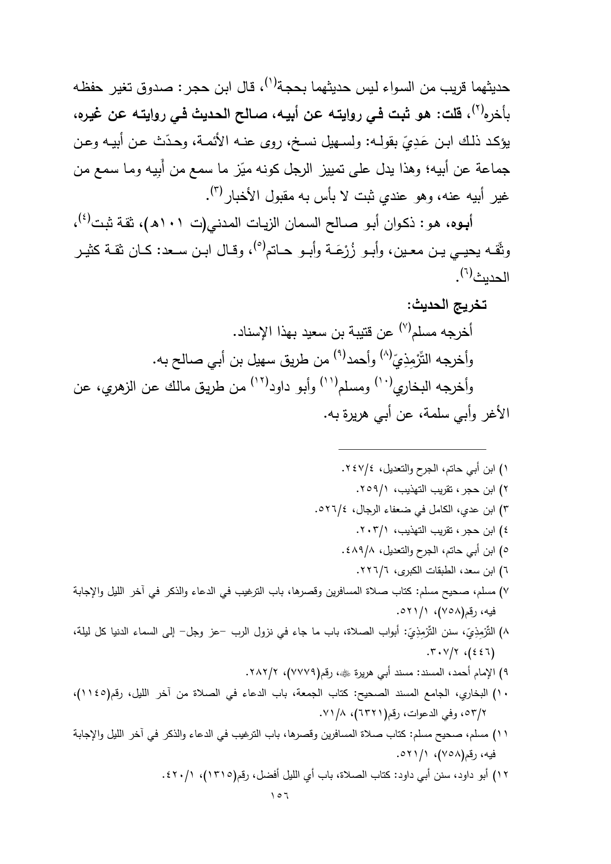حديثهما قريب من السواء ليس حديثهما بحجة (¬1)، قال ابن حجر: صدوق تغير حفظه بأخره (¬2)، قلت: هو ثبت في روايته عن أبيه، صالح الحديث في روايته عن غيره، يؤكد ذلك ابن عَدِيّ بقوله: ولسهيل نسخ، روى عنه الأئمة، وحدّث عن أبيه وعن جماعة عن أبيه؛ وهذا يدل على تمييز الرجل كونه ميّز ما سمع من أَبِيه وما سمع من غير أبيه عنه، وهو عندي ثبت لا بأس به مقبول الأخبار (¬3).
