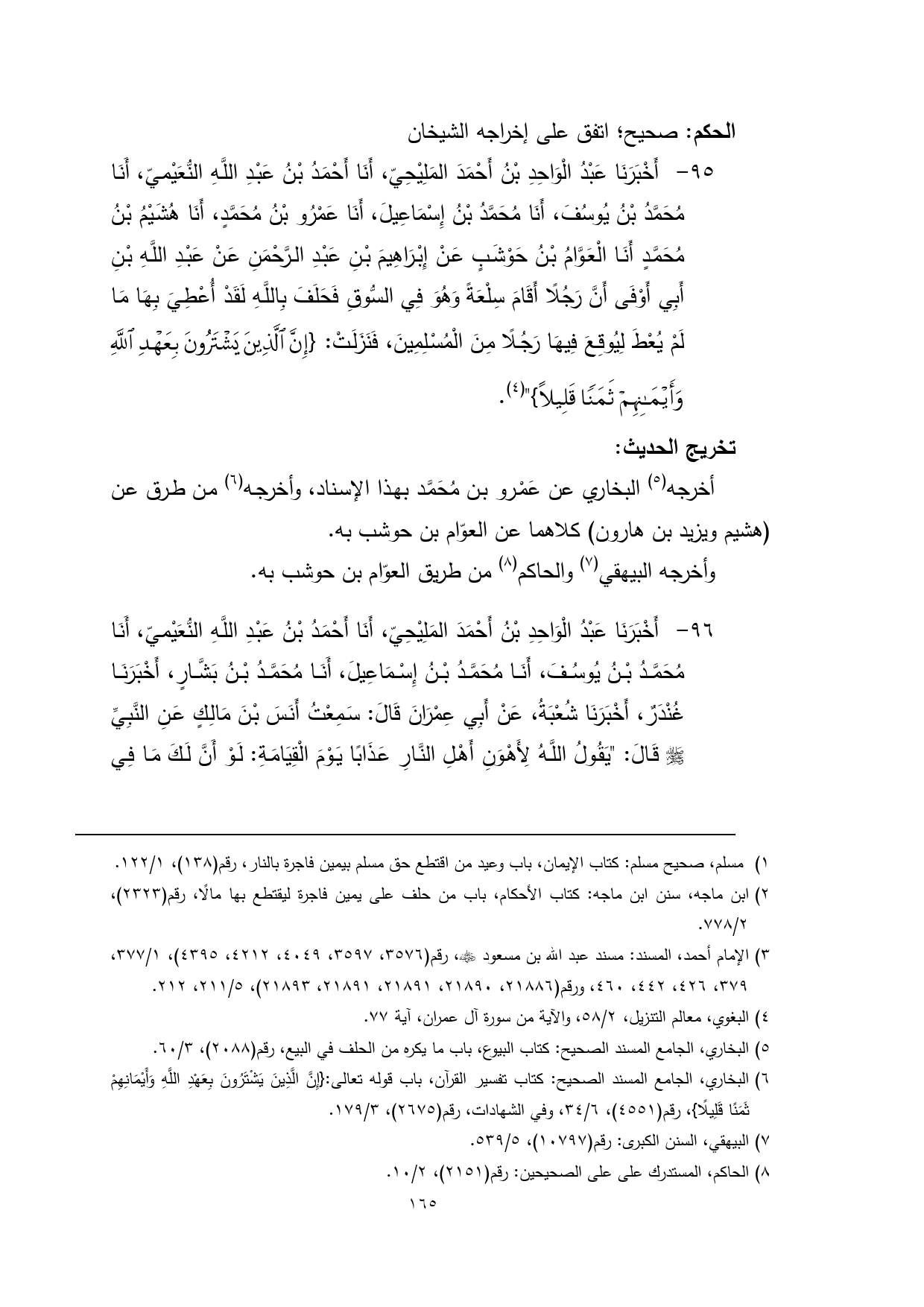 95 - أَخْبَرَنَا عَبْدُ الْوَاحِدِ بْنُ أَحْمَدَ المَلِيْحِيّ، أَنَا أَحْمَدُ بْنُ عَبْدِ اللَّهِ النُّعَيْميّ، أَنَا مُحَمَّدُ بْنُ يُوسُفَ، أَنَا مُحَمَّدُ بْنُ إِسْمَاعِيلَ، أَنَا عَمْرُو بْنُ مُحَمَّدٍ، أَنَا هُشَيْمُ بْنُ مُحَمَّدٍ أَنَا الْعَوَّامُ بْنُ حَوْشَبٍ عَنْ إِبْرَاهِيمَ بْنِ عَبْدِ الرَّحْمَنِ عَنْ عَبْدِ اللَّهِ بْنِ أَبِي أَوْفَى أَنَّ رَجُلًا أَقَامَ سِلْعَةً وَهُوَ فِي السُّوقِ فَحَلَفَ بِاللَّهِ لَقَدْ أُعْطِيَ بِهَا مَا لَمْ يُعْطَ لِيُوقِعَ فِيهَا رَجُلًا مِنَ الْمُسْلِمِينَ، فَنَزَلَتْ: {إِنَّ الَّذِينَ يَشْتَرُونَ بِعَهْدِ اللَّهِ وَأَيْمَانِهِمْ ثَمَنًا قَلِيلًا} " (¬1).