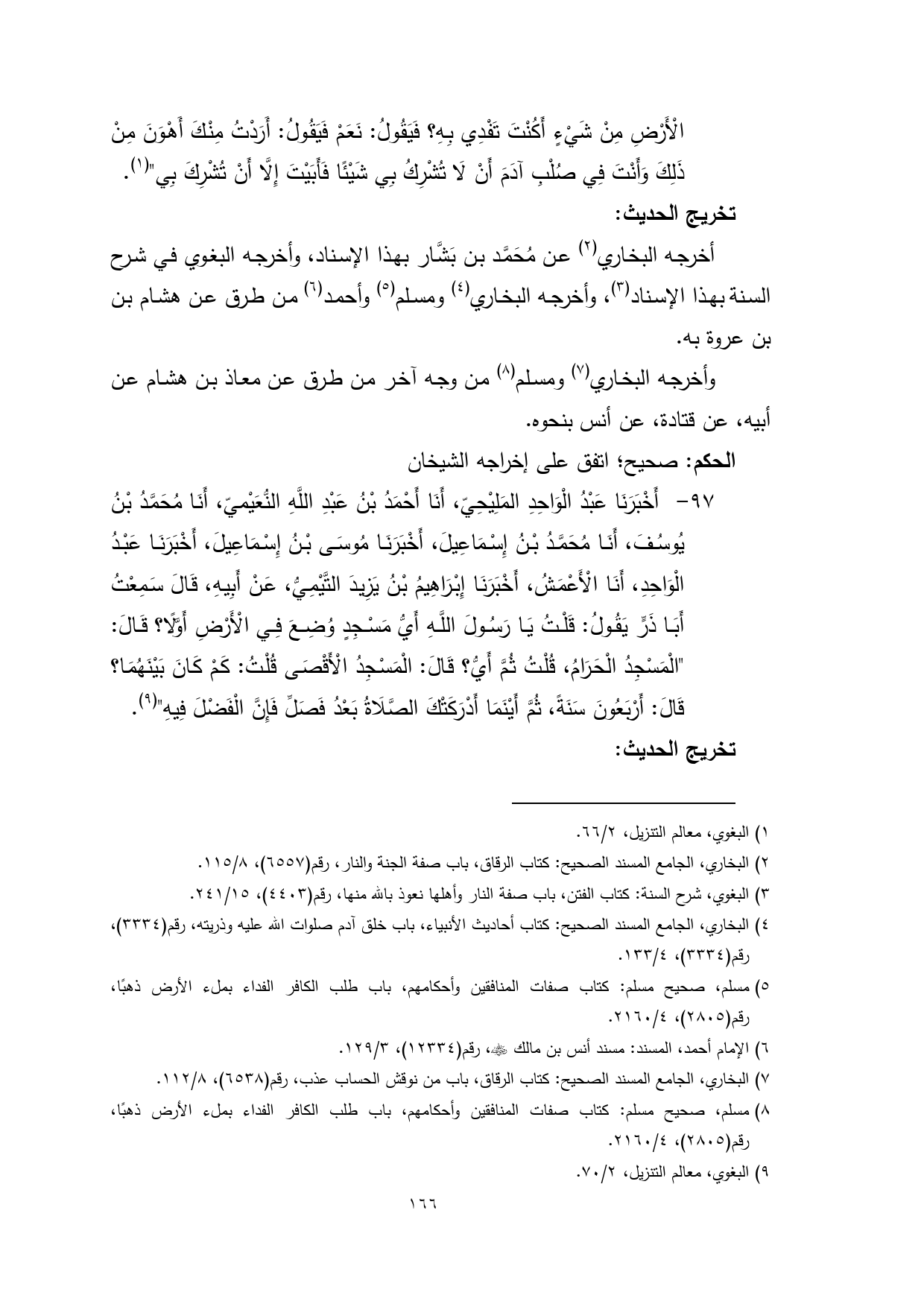 (¬5) مسلم، صحيح مسلم: كتاب صفات المنافقين وأحكامهم، باب طلب الكافر الفداء بملء الأرض ذهبًا، رقم (2805)، 4/ 2160.