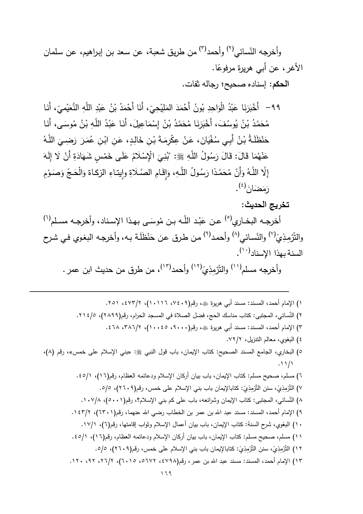 99 - أَخْبَرَنَا عَبْدُ الْوَاحِدِ بْونُ أَحْمَدَ المَلِيْحِيّ، أَنَا أَحْمَدُ بْنُ عَبْدِ اللَّهِ النُّعَيْميّ، أَنَا مُحَمَّدُ بْنُ يُوسُفَ، أَخْبَرَنَا مُحَمَّدُ بْنُ إِسْمَاعِيلَ، أَنَا عَبْدُ اللَّهِ بْنُ مُوسَى، أَنَا حَنْظَلَةُ بْنُ أَبِي سُفْيَانَ، عَنْ عِكْرِمَةَ بْنِ خَالِدٍ، عَنِ ابْنِ عُمَرَ رَضِيَ اللَّهُ عَنْهُمَا قَالَ: قَالَ رَسُولُ اللَّهِ - صلى الله عليه وسلم -: "بُنِيَ الْإِسْلَامُ عَلَى خَمْسٍ شَهَادَةِ أَنْ لَا إِلَهَ إِلَّا اللَّهُ وَأَنَّ مُحَمَّدًا رَسُولُ اللَّهِ، وَإِقَامِ الصَّلَاةِ وإيتاءِ الزكاة وَالْحَجِّ وَصَوْمِ رَمَضَانَ (¬3).