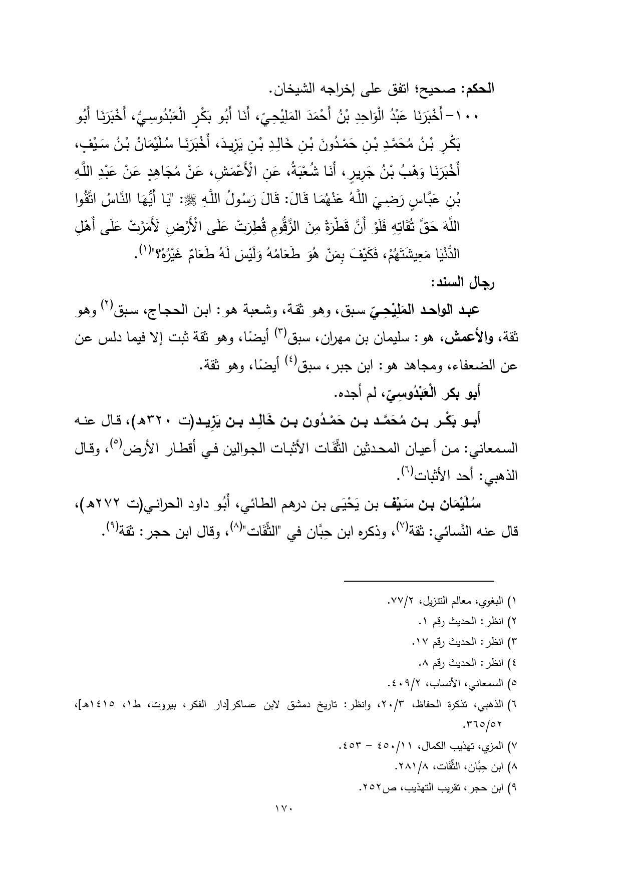 عبد الواحد المَلِيْحِيّ سبق، وهو ثقة، وشعبة هو: ابن الحجاج، سبق (¬2) وهو ثقة، والأعمش، هو: سليمان بن مهران، سبق (¬3) أيضًا، وهو ثقة ثبت إلا فيما دلس عن الضعفاء، ومجاهد هو: ابن جبر، سبق (¬4) أيضًا، وهو ثقة.