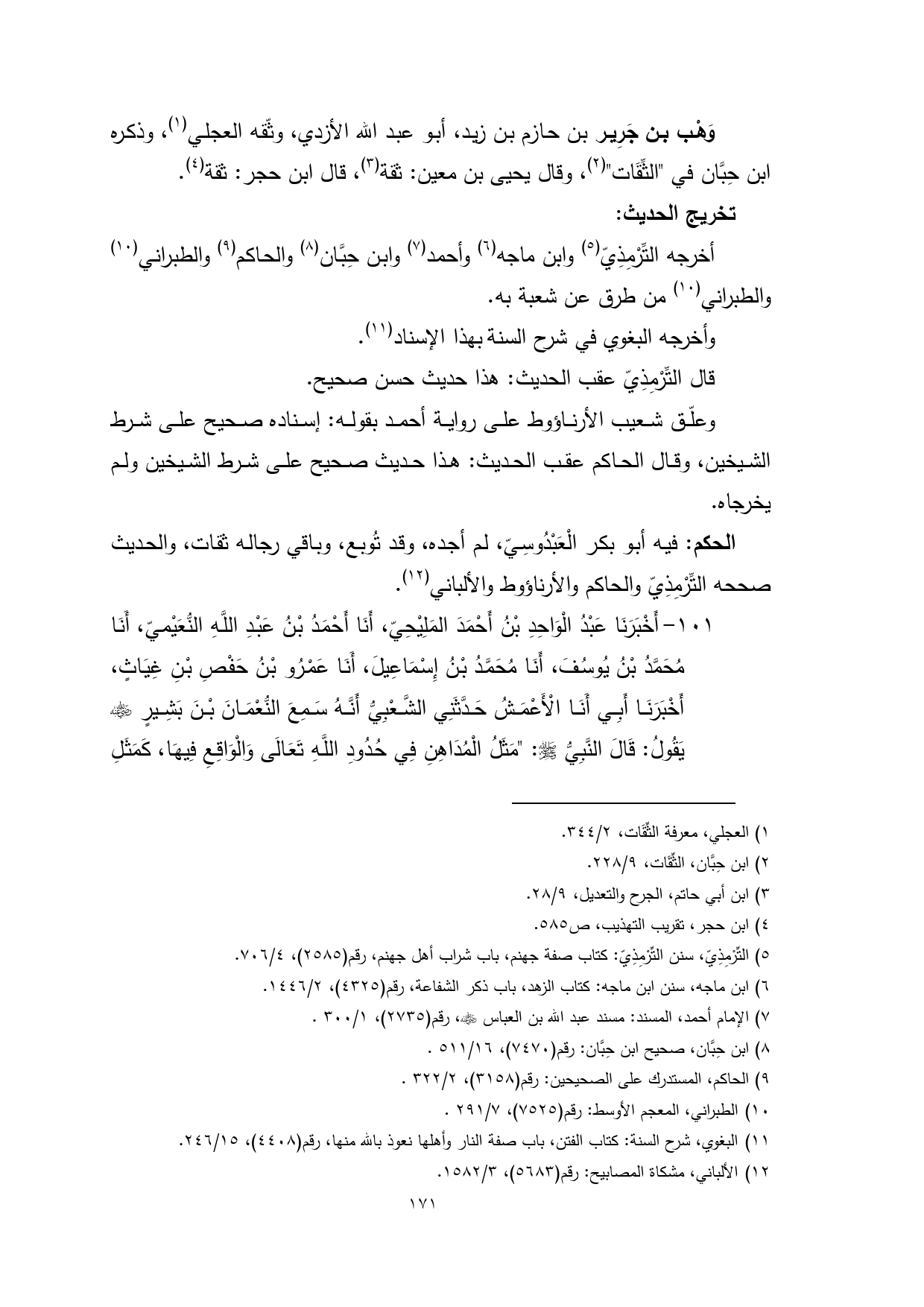 وَهْب بن جَرِير بن حازم بن زيد، أبو عبد الله الأزدي، وثّقه العجلي (¬1)، وذكره ابن حِبَّان في "الثِّقَات" (¬2)، وقال يحيى بن معين: ثقة (¬3)، قال ابن حجر: ثقة (¬4).