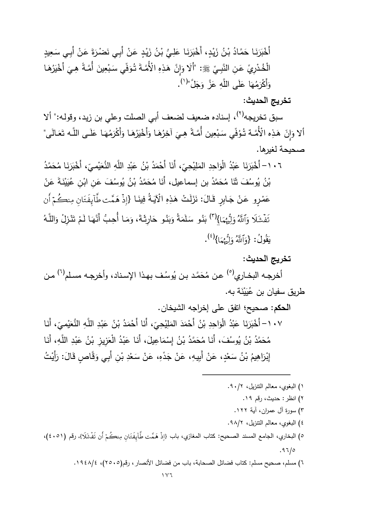 (¬5) البخاري، الجامع المسند الصحيح: كتاب المغازي، باب {إِذْ هَمَّتْ طَائِفَتَانِ مِنْكُمْ أَنْ تَفْشَلَا}، رقم (4051)، 5/ 96.