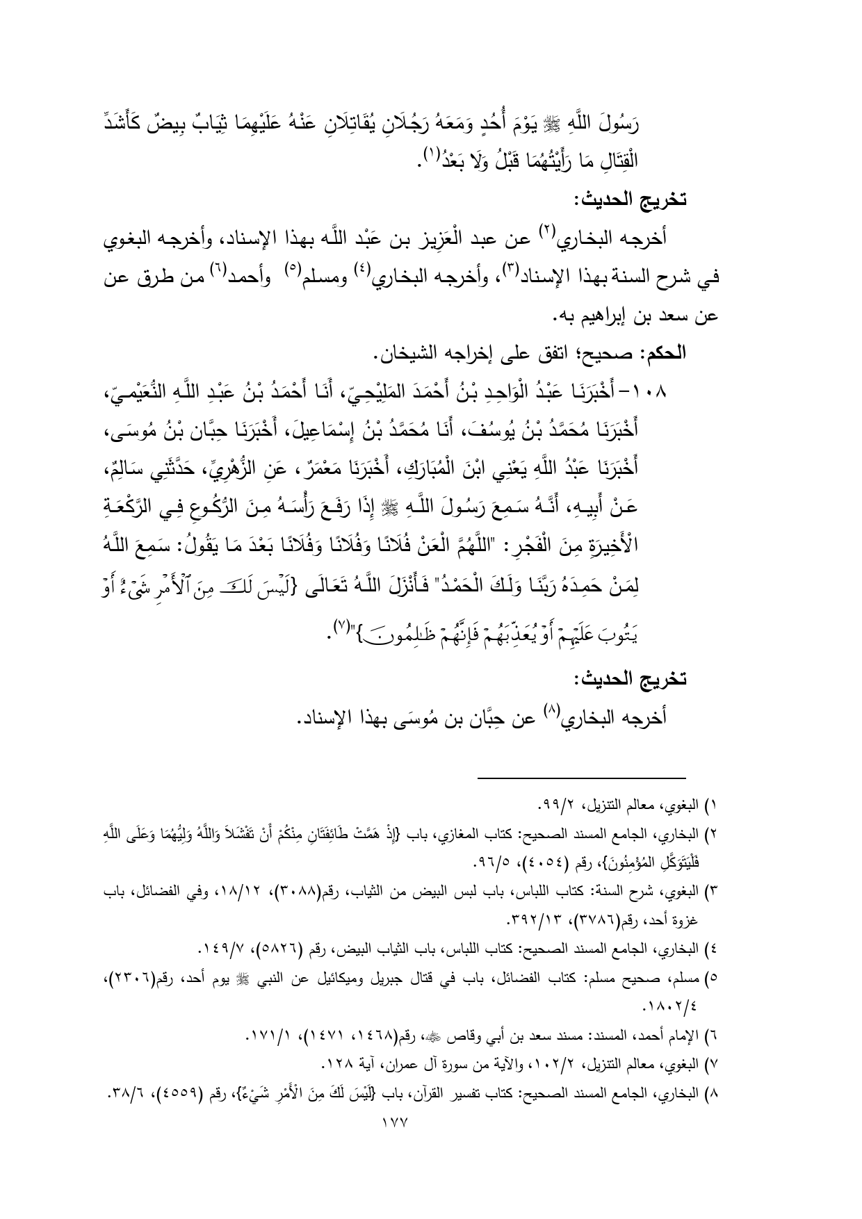 108 - أَخْبَرَنَا عَبْدُ الْوَاحِدِ بْنُ أَحْمَدَ المَلِيْحِيّ، أَنَا أَحْمَدُ بْنُ عَبْدِ اللَّهِ النُّعَيْميّ، أَخْبَرَنَا مُحَمَّدُ بْنُ يُوسُفَ، أَنَا مُحَمَّدُ بْنُ إِسْمَاعِيلَ، أَخْبَرَنَا حِبَّان بْنُ مُوسَى، أَخْبَرَنَا عَبْدُ اللَّهِ يَعْنِي ابْنَ الْمُبَارَكِ، أَخْبَرَنَا مَعْمَرٌ، عَنِ الزُّهْرِيِّ، حَدَّثَنِي سَالِمٌ، عَنْ أَبِيهِ، أَنَّهُ سَمِعَ رَسُولَ اللَّهِ - صلى الله عليه وسلم - إِذَا رَفَعَ رَأْسَهُ مِنَ الرُّكُوعِ فِي الرَّكْعَةِ الْأَخِيرَةِ مِنَ الْفَجْرِ: "اللَّهُمَّ الْعَنْ فُلَانًا وَفُلَانًا وَفُلَانًا بَعْدَ مَا يَقُولُ: سَمِعَ اللَّهُ لِمَنْ حَمِدَهُ رَبَّنَا وَلَكَ الْحَمْدُ" فَأَنْزَلَ اللَّهُ تَعَالَى {لَيْسَ لَكَ مِنَ الْأَمْرِ شَيْءٌ أَوْ يَتُوبَ عَلَيْهِمْ أَوْ يُعَذِّبَهُمْ فَإِنَّهُمْ ظَالِمُونَ} " (¬7).