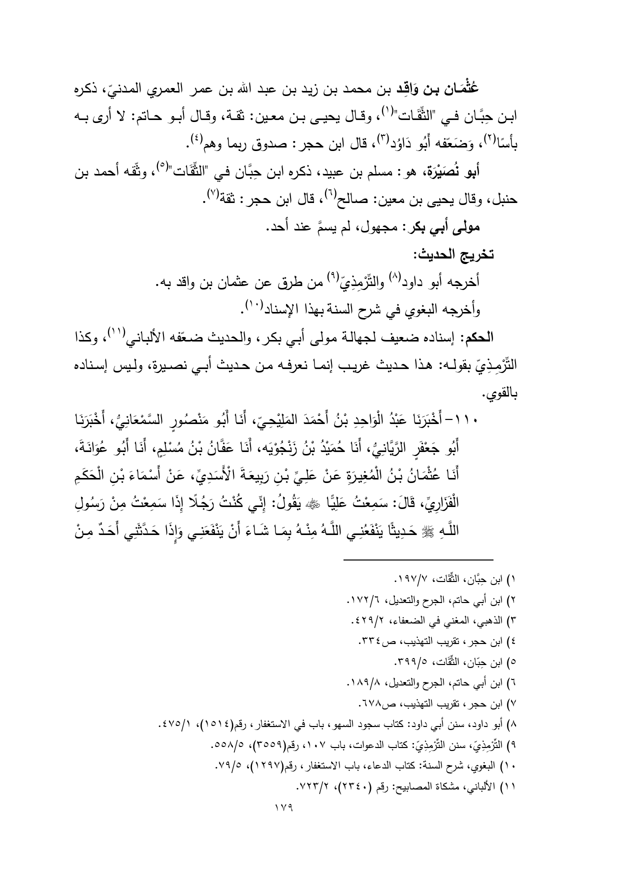 الحكم: إسناده ضعيف لجهالة مولى أبي بكر، والحديث ضعّفه الألباني (¬11)، وكذا التِّرْمِذِيّ بقوله: هذا حديث غريب إنما نعرفه من حديث أبي نصيرة، وليس إسناده بالقوي.