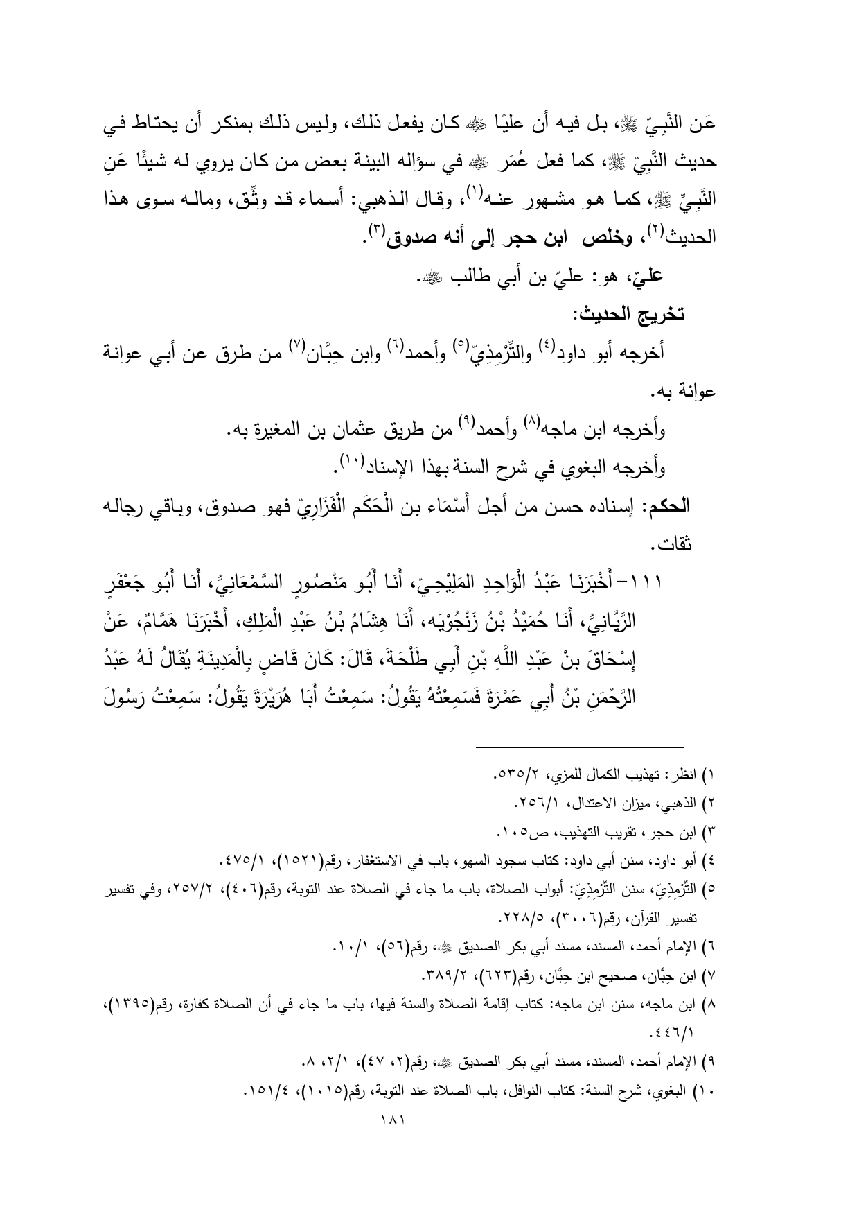 عَن النَّبِيّ - صلى الله عليه وسلم -، بل فيه أن عليًا - رضي الله عنه - كان يفعل ذلك، وليس ذلك بمنكر أن يحتاط في حديث النَّبِيّ - صلى الله عليه وسلم -، كما فعل عُمَر - رضي الله عنه - في سؤاله البينة بعض من كان يروي له شيئًا عَنِ النَّبِيِّ - صلى الله عليه وسلم -، كما هو مشهور عنه (¬1)، وقال الذهبي: أسماء قد وثِّق، وماله سوى هذا الحديث (¬2)، وخلص ابن حجر إلى أنه صدوق (¬3).