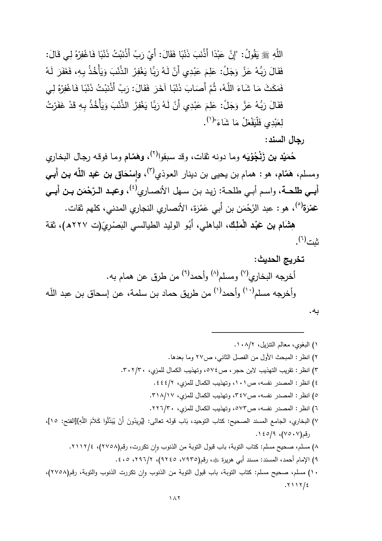 حُمَيْد بن زَنْجُوْيَه وما دونه ثقات، وقد سبقوا (¬2)، وهَمَّام وما فوقه رجال البخاري ومسلم، هَمَّام، هو: همام بن يحيى بن دينار العوذي (¬3)، وإِسْحَاق بن عَبد اللَّه بن أَبي طلحة، واسم أبي طلحة: زيد بن سهل الأنصاري (¬4)، وعبد الرَّحْمَن بن أَبي عَمْرَة (¬5)، هو: عبد الرَّحْمَن بن أَبي عَمْرَة، الأنصاري النجاري المدني، كلهم ثقات.