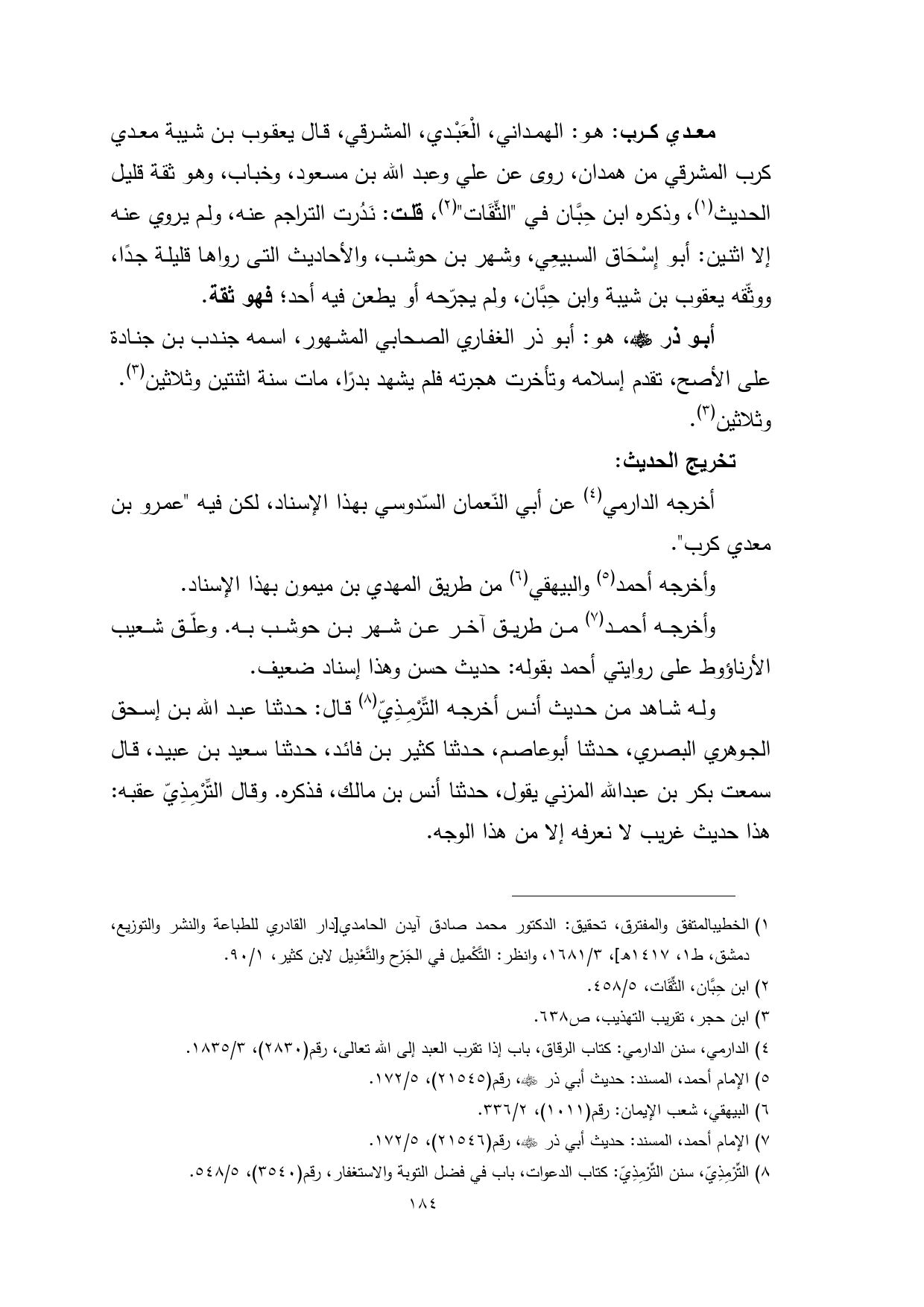 معدي كرب: هو: الهمداني، الْعَبْدي، المشرقي، قال يعقوب بن شيبة معدي كرب المشرقي من همدان، روى عن علي وعبد الله بن مسعود، وخباب، وهو ثقة قليل الحديث (¬1)، وذكره ابن حِبَّان في "الثِّقَات" (¬2)، قلت: نَدُرت التراجم عنه، ولم يروي عنه إلا اثنين: أبو إِسْحَاق السبيعِي، وشهر بن حوشب، والأحاديث التى رواها قليلة جدًا، ووثّقه يعقوب بن شيبة وابن حِبَّان، ولم يجرّحه أو يطعن فيه أحد؛ فهو ثقة.