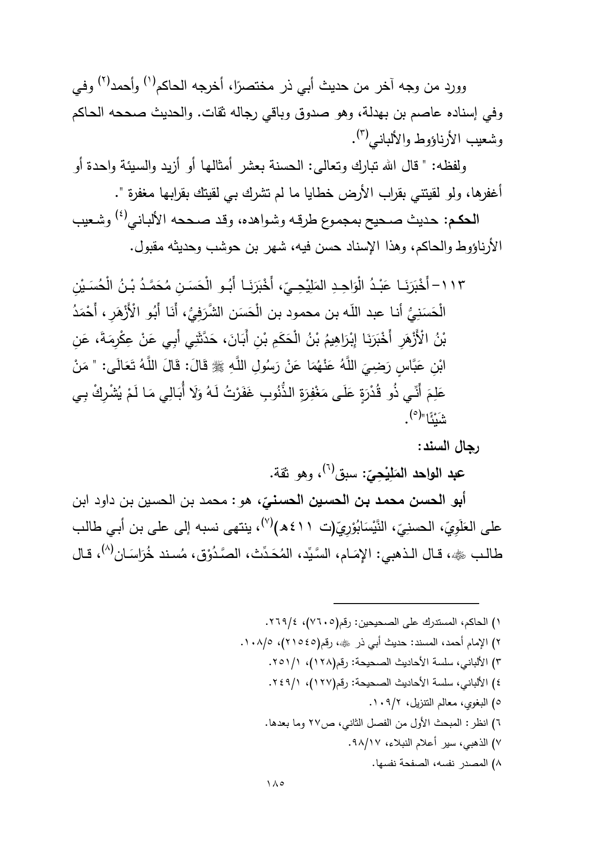 113 - أَخْبَرَنَا عَبْدُ الْوَاحِدِ المَلِيْحِيّ، أَخْبَرَنَا أَبُو الْحَسَنِ مُحَمَّدُ بْنُ الْحُسَيْنِ الْحَسَنِيُّ أنا عبد الله بن محمود بن الْحَسَن الشَّرَفِيُّ، أَنَا أَبُو الْأَزْهَرِ، أَحْمَدُ بْنُ الْأَزْهَرِ أَخْبَرَنَا إِبْرَاهِيمُ بْنُ الْحَكَمِ بْنِ أَبَانَ، حَدَّثَنِي أَبِي عَنْ عِكْرِمَةَ، عَنِ ابْنِ عَبَّاسٍ رَضِيَ اللَّهُ عَنْهُمَا عَنْ رَسُولِ اللَّهِ - صلى الله عليه وسلم - قَالَ: قَالَ اللَّهُ تَعَالَى: " مَنْ عَلِمَ أَنِّي ذُو قُدْرَةٍ عَلَى مَغْفِرَةِ الذُّنُوبِ غَفَرْتُ لَهُ وَلَا أُبَالِي مَا لَمْ يُشْرِكْ بِي شَيْئًا" (¬5).