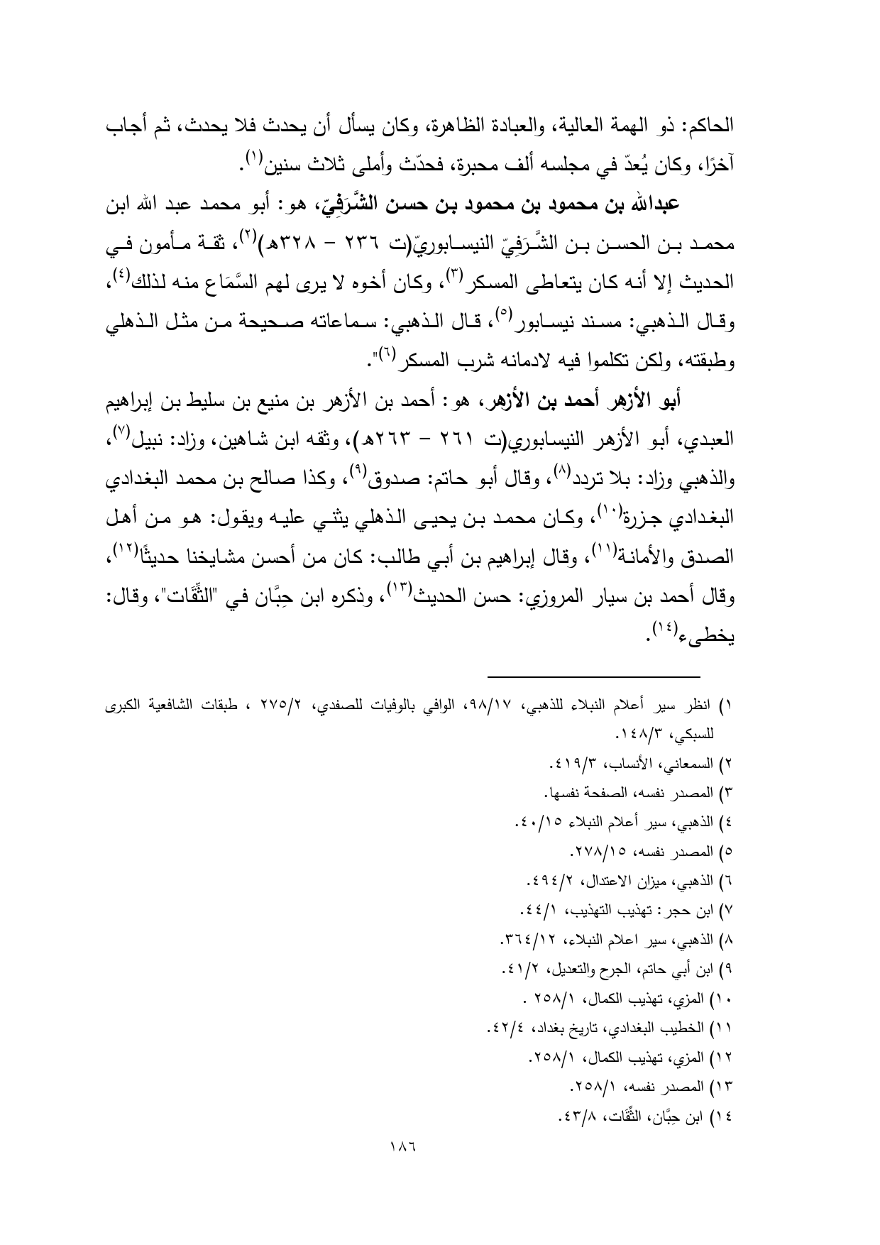 عبدالله بن محمود بن محمود بن حسن الشَّرَفِيّ، هو: أبو محمد عبد الله ابن محمد بن الحسن بن الشَّرَفِيّ النيسابوريّ (ت 236 - 328 هـ) (¬2)، ثقة مأمون في الحديث إلا أنه كان يتعاطى المسكر (¬3)، وكان أخوه لا يرى لهم السَّمَاع منه لذلك (¬4)، وقال الذهبي: مسند نيسابور (¬5)، قال الذهبي: سماعاته صحيحة من مثل الذهلي وطبقته، ولكن تكلموا فيه لادمانه شرب المسكر (¬6) ".