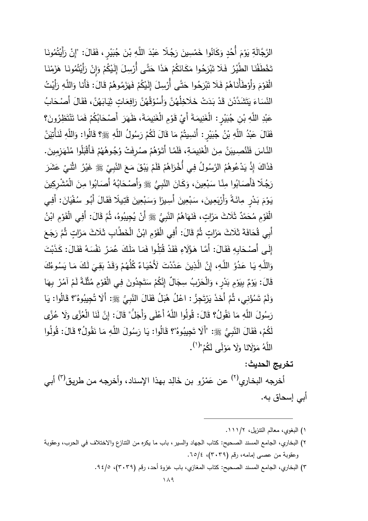 الرَّجَّالَةِ يَوْمَ أُحُدٍ وَكَانُوا خَمْسِينَ رَجُلًا عَبْدَ اللَّهِ بْنَ جُبَيْرٍ، فَقَالَ: "إِنْ رَأَيْتُمُونَا تَخْطَفُنَا الطَّيْرُ فَلَا تَبْرَحُوا مَكَانَكُمْ هَذَا حَتَّى أُرْسِلَ إِلَيْكُمْ وَإِنْ رَأَيْتُمُونَا هَزَمْنَا الْقَوْمَ وَأَوْطَأْنَاهُمْ فَلَا تَبْرَحُوا حَتَّى أُرْسِلَ إِلَيْكُمْ فَهَزَمُوهُمْ قَالَ: فَأَنَا وَاللَّهِ رَأَيْتُ النِّسَاءَ يَتَشَدَّدْنَ قَدْ بَدَتْ خَلَاخِلُهُنَّ وَأَسْوُقُهُنَّ رَافِعَاتٍ ثِيَابَهُنَّ، فَقَالَ أَصْحَابُ عَبْدِ اللَّهِ بْنِ جُبَيْرٍ: الْغَنِيمَةَ أَيْ قَوْمِ الْغَنِيمَةَ، ظَهَرَ أَصْحَابُكُمْ فَمَا تَنْتَظِرُونَ؟ فَقَالَ عَبْدُ اللَّهِ بْنُ جُبَيْرٍ: أَنَسِيتُمْ مَا قَالَ لَكُمْ رَسُولُ اللَّهِ - صلى الله عليه وسلم -؟ قَالُوا: وَاللَّهِ لَنَأْتِيَنَّ النَّاسَ فَلَنُصِيبَنَّ مِنَ الْغَنِيمَةِ، فَلَمَّا أَتَوْهُمْ صُرِفَتْ وُجُوهُهُمْ فَأَقْبَلُوا مُنْهَزِمِينَ. فَذَاكَ إِذْ يَدْعُوهُمُ الرَّسُولُ فِي أُخْرَاهُمْ فَلَمْ يَبْقَ مَعَ النَّبِيِّ - صلى الله عليه وسلم - غَيْرُ اثْنَيْ عَشَرَ رَجُلًا فَأَصَابُوا مِنَّا سَبْعِينَ، وَكَانَ النَّبِيُّ - صلى الله عليه وسلم - وَأَصْحَابُهُ أَصَابُوا مِنَ الْمُشْرِكِينَ يَوْمَ بَدْرٍ مِائَةً وَأَرْبَعِينَ، سَبْعِينَ أَسِيرًا وَسَبْعِينَ قَتِيلًا فَقَالَ أَبُو سُفْيَانَ: أَفِي الْقَوْمِ مُحَمَّدٌ ثَلَاثَ مَرَّاتٍ، فَنَهَاهُمُ النَّبِيُّ - صلى الله عليه وسلم - أَنْ يُجِيبُوهُ، ثُمَّ قَالَ: أَفِي الْقَوْمِ ابْنُ أَبِي قُحَافَةَ ثَلَاثَ مَرَّاتٍ ثُمَّ قَالَ: أَفِي الْقَوْمِ ابْنُ الْخَطَّابِ ثَلَاثَ مَرَّاتٍ ثُمَّ رَجَعَ إِلَى أَصْحَابِهِ فَقَالَ: أَمَّا هَؤُلَاءِ فَقَدْ قُتِلُوا فَمَا مَلَكَ عُمَرُ نَفْسَهُ فَقَالَ: كَذَبْتَ وَاللَّهِ يَا عَدُوَّ اللَّهِ، إِنَّ الَّذِينَ عَدَّدْتَ لَأَحْيَاءٌ كُلُّهُمْ وَقَدْ بَقِيَ لَكَ مَا يَسُوءُكَ قَالَ: يَوْمٌ بِيَوْمِ بَدْرٍ، وَالْحَرْبُ سِجَالٌ إِنَّكُمْ سَتَجِدُونَ فِي الْقَوْمِ مُثْلَةً لَمْ آمُرْ بِهَا وَلَمْ تَسُؤْنِي، ثُمَّ أَخَذَ يَرْتَجِزُ: اعْلُ هُبَلُ فَقَالَ النَّبِيُّ - صلى الله عليه وسلم -: أَلَا تُجِيبُوهُ"؟ قَالُوا: يَا رَسُولَ اللَّهِ مَا نَقُولُ؟ قَالَ: قُولُوا اللَّهُ أَعْلَى وَأَجَلُّ" قَالَ: إِنَّ لَنَا الْعُزَّى وَلَا عُزَّى لَكُمْ، فَقَالَ النَّبِيُّ - صلى الله عليه وسلم -: "أَلَا تَجِيبُوهُ"؟ قَالُوا: يَا رَسُولَ اللَّهِ مَا نَقُولُ؟ قَالَ: قُولُوا اللَّهُ مَوْلَانَا وَلَا مَوْلًى لَكُمْ" (¬1).