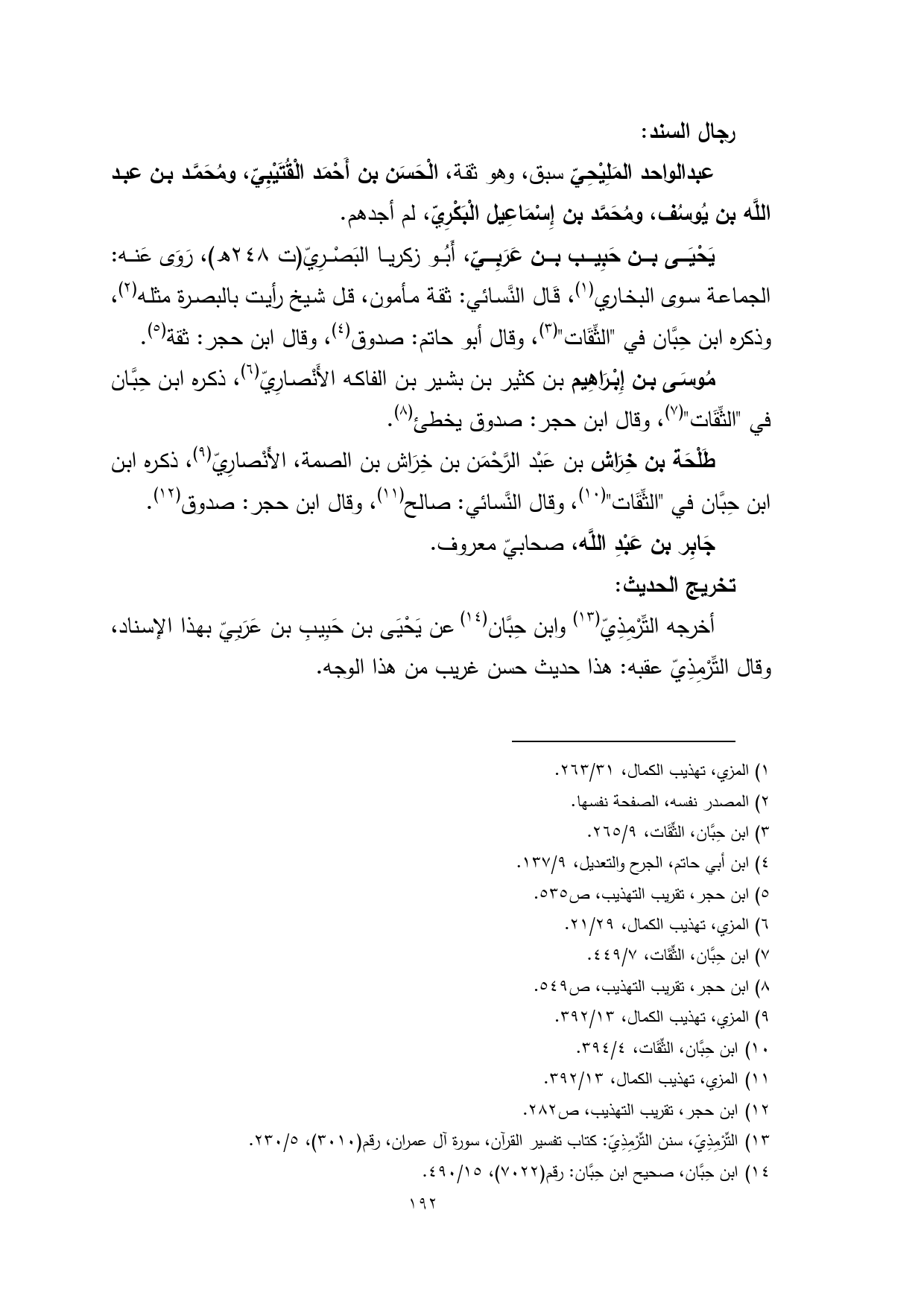 أخرجه التِّرْمِذِيّ (¬13) وابن حِبَّان (¬14) عن يَحْيَى بن حَبِيبِ بن عَرَبِيّ بهذا الإسناد، وقال التِّرْمِذِيّ عقبه: هذا حديث حسن غريب من هذا الوجه.