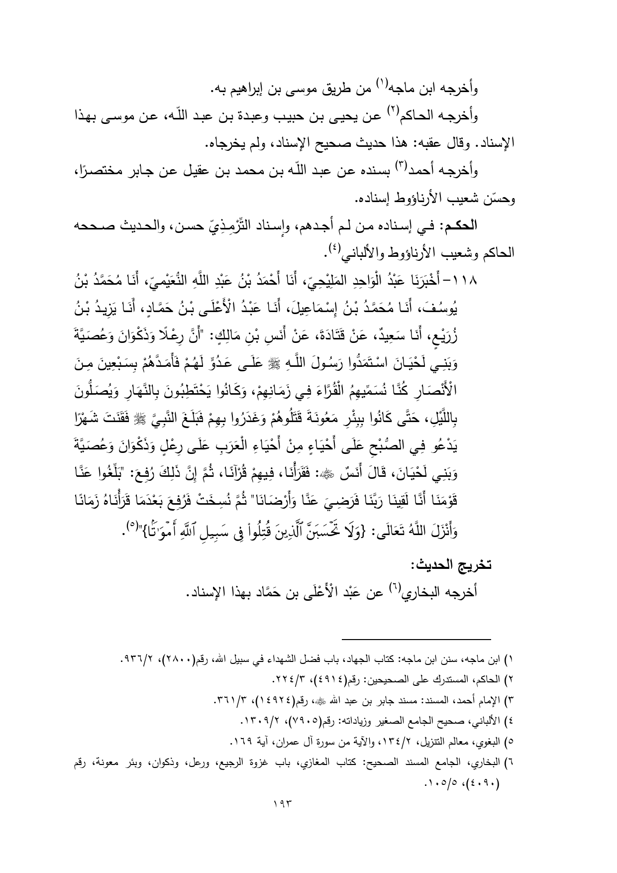 118 - أَخْبَرَنَا عَبْدُ الْوَاحِدِ المَلِيْحِيّ، أَنَا أَحْمَدُ بْنُ عَبْدِ اللَّهِ النُّعَيْميّ، أَنَا مُحَمَّدُ بْنُ يُوسُفَ، أَنَا مُحَمَّدُ بْنُ إِسْمَاعِيلَ، أَنَا عَبْدُ الْأَعْلَى بْنُ حَمَّادٍ، أَنَا يَزِيدُ بْنُ زُرَيْعٍ، أَنَا سَعِيدٌ، عَنْ قَتَادَةَ، عَنْ أَنَسِ بْنِ مَالِكٍ: "أَنَّ رِعْلًا وَذَكْوَانَ وَعُصَيَّةَ وَبَنِي لَحْيَانَ اسْتَمَدُّوا رَسُولَ اللَّهِ - صلى الله عليه وسلم - عَلَى عَدُوٍّ لَهُمْ فَأَمَدَّهُمْ بِسَبْعِينَ مِنَ الْأَنْصَارِ كُنَّا نُسَمِّيهِمُ الْقُرَّاءَ فِي زَمَانِهِمْ، وَكَانُوا يَحْتَطِبُونَ بِالنَّهَارِ وَيُصَلُّونَ بِاللَّيْلِ، حَتَّى كَانُوا بِبِئْرِ مَعُونَةَ قَتَلُوهُمْ وَغَدَرُوا بِهِمْ فَبَلَغَ النَّبِيَّ - صلى الله عليه وسلم - فَقَنَتَ شَهْرًا يَدْعُو فِي الصُّبْحِ عَلَى أَحْيَاءٍ مِنْ أَحْيَاءِ الْعَرَبِ عَلَى رِعْلٍ وَذَكْوَانَ وَعُصَيَّةَ وَبَنِي لَحْيَانَ، قَالَ أَنَسٌ - رضي الله عنه -: فَقَرَأْنَا، فِيهِمْ قُرْآنًا، ثُمَّ إِنَّ ذَلِكَ رُفِعَ: "بَلِّغُوا عَنَّا قَوْمَنَا أَنَّا لَقِينَا رَبَّنَا فَرَضِيَ عَنَّا وَأَرْضَانَا" ثُمَّ نُسِخَتْ فَرُفِعَ بَعْدَمَا قَرَأْنَاهُ زَمَانًا وَأَنْزَلَ اللَّهُ تَعَالَى: {وَلَا تَحْسَبَنَّ الَّذِينَ قُتِلُوا فِي سَبِيلِ اللَّهِ أَمْوَاتًا} " (¬5).
