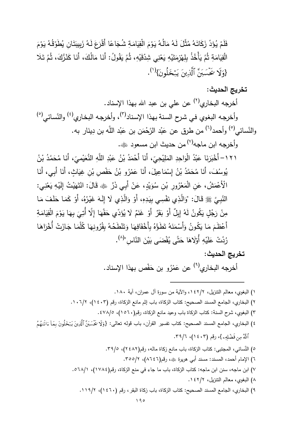 (¬3) البغوي، شرح السنة: كتاب الزكاة باب وعيد مانع الزكاة، رقم (1560)، 5/ 478.