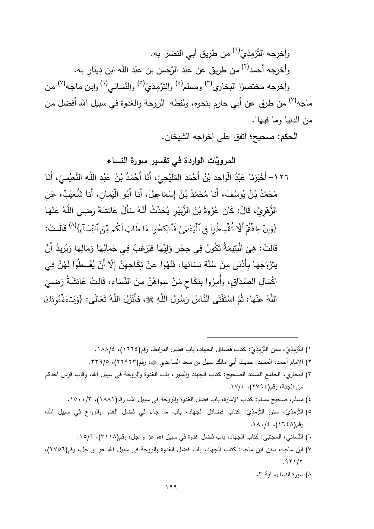 (¬7) ابن ماجه، سنن ابن ماجه: كتاب الجهاد، باب فضل الغدوة والروحة في سبيل الله عز وجل، رقم (2756)، 2/ 921.