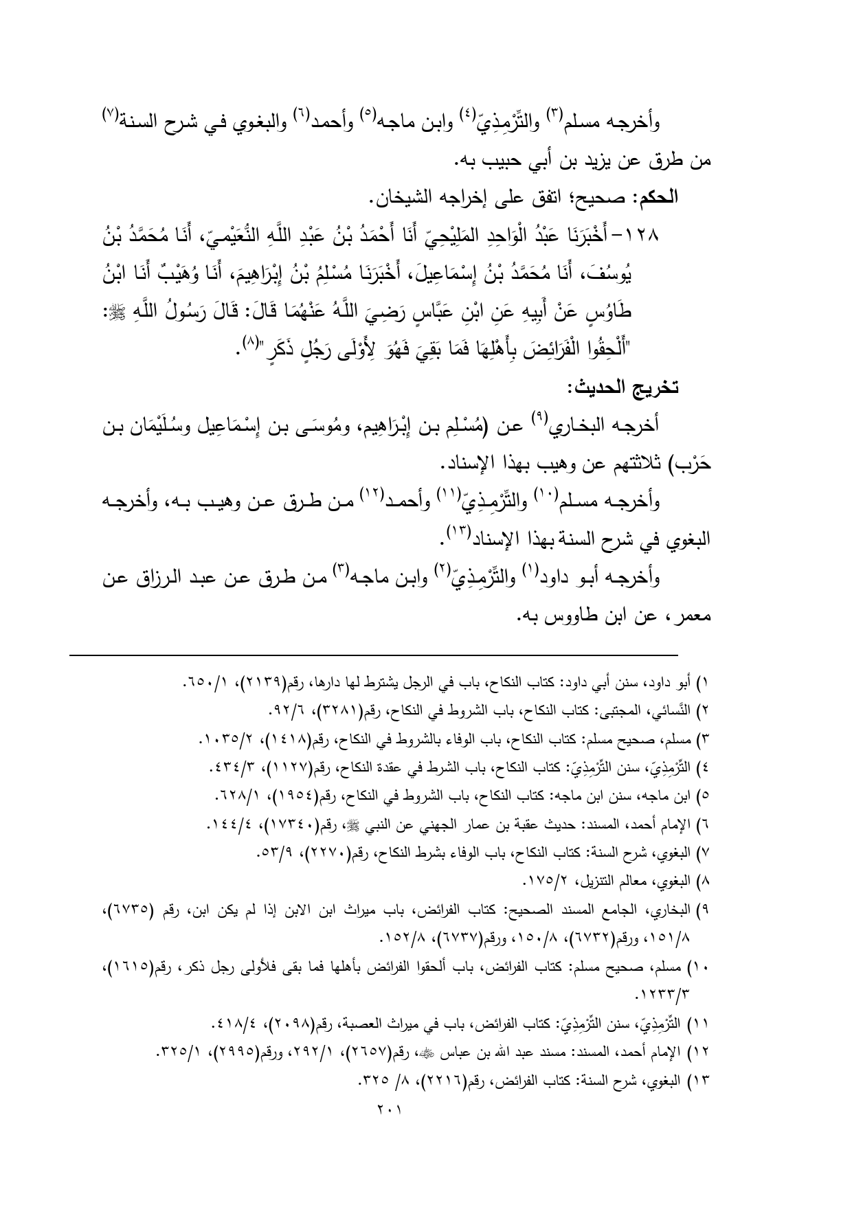 128 - أَخْبَرَنَا عَبْدُ الْوَاحِدِ المَلِيْحِيّ أَنَا أَحْمَدُ بْنُ عَبْدِ اللَّهِ النُّعَيْميّ، أَنَا مُحَمَّدُ بْنُ يُوسُفَ، أَنَا مُحَمَّدُ بْنُ إِسْمَاعِيلَ، أَخْبَرَنَا مُسْلِمُ بْنُ إِبْرَاهِيمَ، أَنَا وُهَيْبٌ أَنَا ابْنُ طَاوُسٍ عَنْ أَبِيهِ عَنِ ابْنِ عَبَّاسٍ رَضِيَ اللَّهُ عَنْهُمَا قَالَ: قَالَ رَسُولُ اللَّهِ - صلى الله عليه وسلم -: "أَلْحِقُوا الْفَرَائِضَ بِأَهْلِهَا فَمَا بَقِيَ فَهُوَ لِأَوْلَى رَجُلٍ ذَكَرٍ" (¬6).