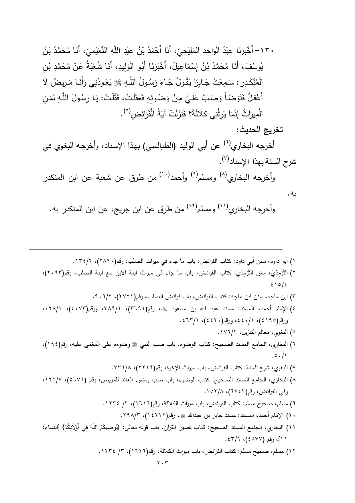 130 - أَخْبَرَنَا عَبْدُ الْوَاحِدِ المَلِيْحِيّ، أَنَا أَحْمَدُ بْنُ عَبْدِ اللَّهِ النُّعَيْميّ، أَنَا مُحَمَّدُ بْنُ يُوسُفَ، أَنَا مُحَمَّدُ بْنُ إِسْمَاعِيلَ، أَخْبَرَنَا أَبُو الْوَلِيدِ، أَنَا شُعْبَةُ عَنْ مُحَمَّدِ بْنِ الْمُنْكَدِرِ: سَمِعْتُ جَابِرًا يَقُولُ جَاءَ رَسُولُ اللَّهِ - صلى الله عليه وسلم - يَعُودُنِي وَأَنَا مَرِيضٌ لَا أَعْقِلُ فَتَوَضَّأَ وَصَبَّ عَلَيَّ مِنْ وَضُوئِهِ فَعَقَلَتُ، فَقُلْتُ: يَا رَسُولَ اللَّهِ لِمَنِ الْمِيرَاثُ إِنَّمَا يَرِثُنِي كَلَالَةً؟ فَنَزَلَتْ آيَةُ الْفَرَائِضِ (¬1).