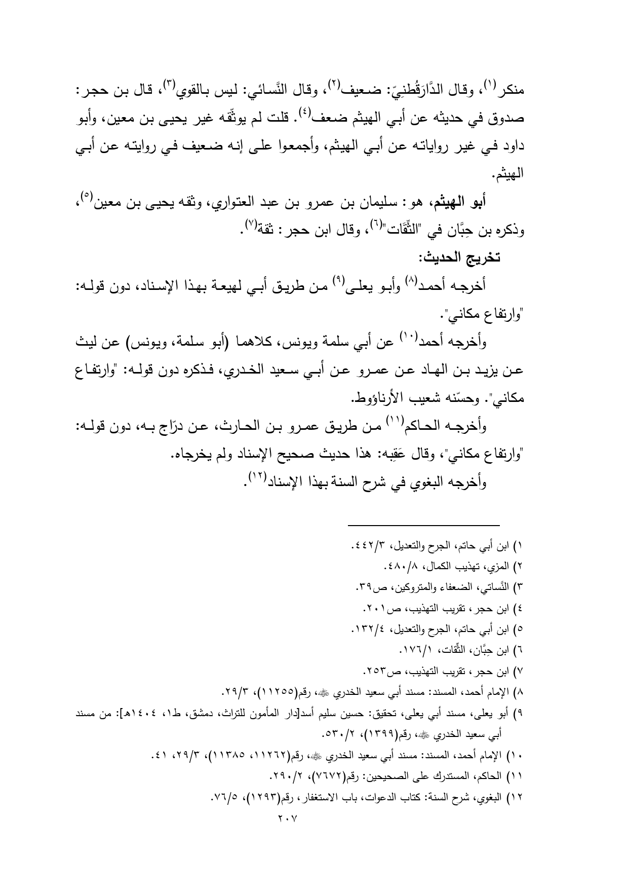 منكر (¬1)، وقال الدَّارَقُطنِيّ: ضعيف (¬2)، وقال النَّسائي: ليس بالقوي (¬3)، قال بن حجر: صدوق في حديثه عن أبي الهيثم ضعف (¬4). قلت لم يوثّقه غير يحيى بن معين، وأبو داود في غير رواياته عن أبي الهيثم، وأجمعوا على إنه ضعيف في روايته عن أبي الهيثم.