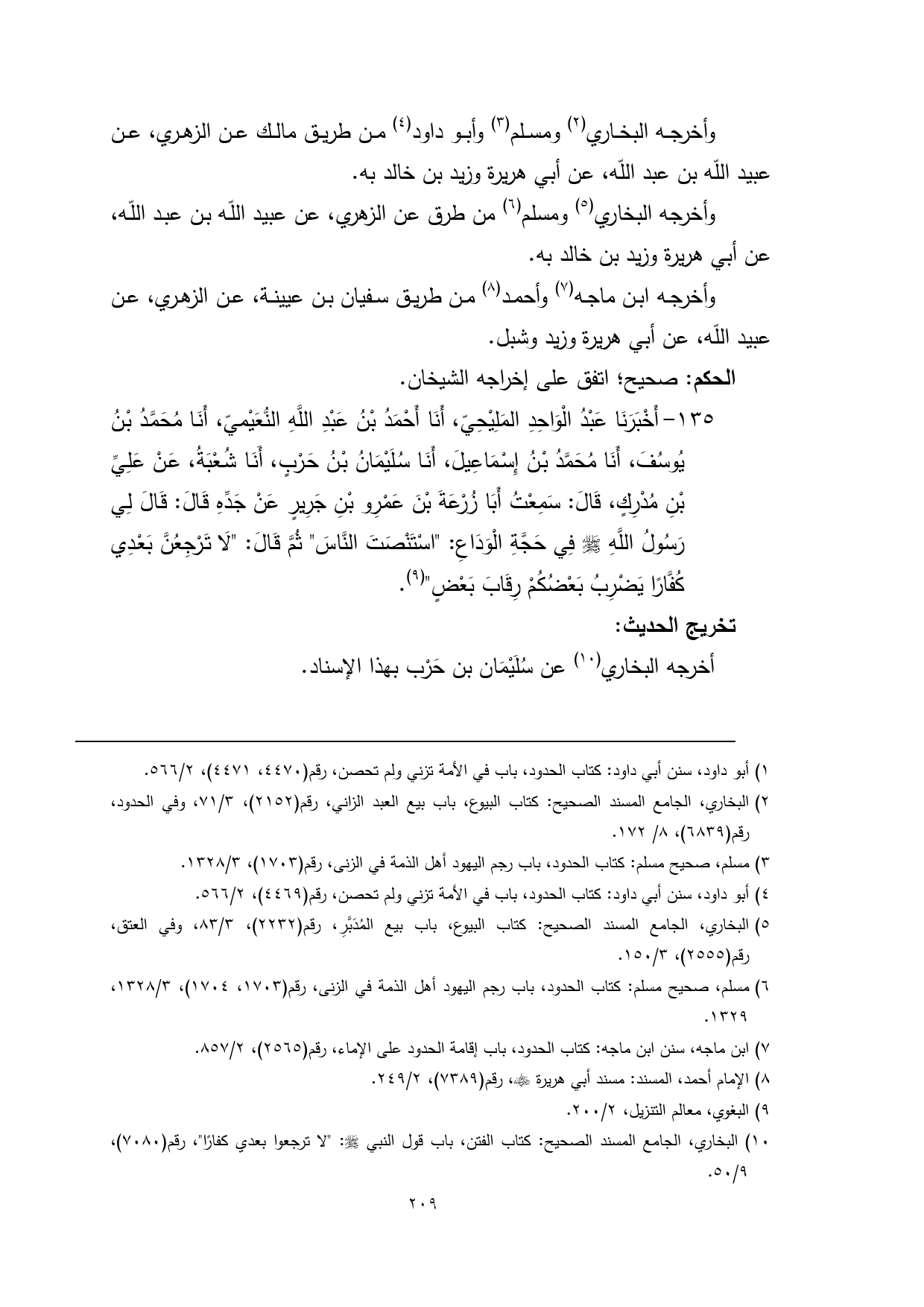 135 - أَخْبَرَنَا عَبْدُ الْوَاحِدِ المَلِيْحِيّ، أَنَا أَحْمَدُ بْنُ عَبْدِ اللَّهِ النُّعَيْميّ، أَنَا مُحَمَّدُ بْنُ يُوسُفَ، أَنَا مُحَمَّدُ بْنُ إِسْمَاعِيلَ، أَنَا سُلَيْمَانُ بْنُ حَرْبٍ، أَنَا شُعْبَةُ، عَنْ عَلِيِّ بْنِ مُدْرِكٍ، قَالَ: سَمِعْتُ أَبَا زُرْعَةَ بْنَ عَمْرِو بْنِ جَرِيرٍ عَنْ جَدِّهِ قَالَ: قَالَ لِي رَسُولُ اللَّهِ - صلى الله عليه وسلم - فِي حَجَّةِ الْوَدَاعِ: "اسْتَنْصَتَ النَّاسَ" ثُمَّ قَالَ: "لَا تَرْجِعُنَّ بَعْدِي كُفَّارًا يَضْرِبُ بَعْضُكُمْ رِقَابَ بَعْضٍ" (¬8).