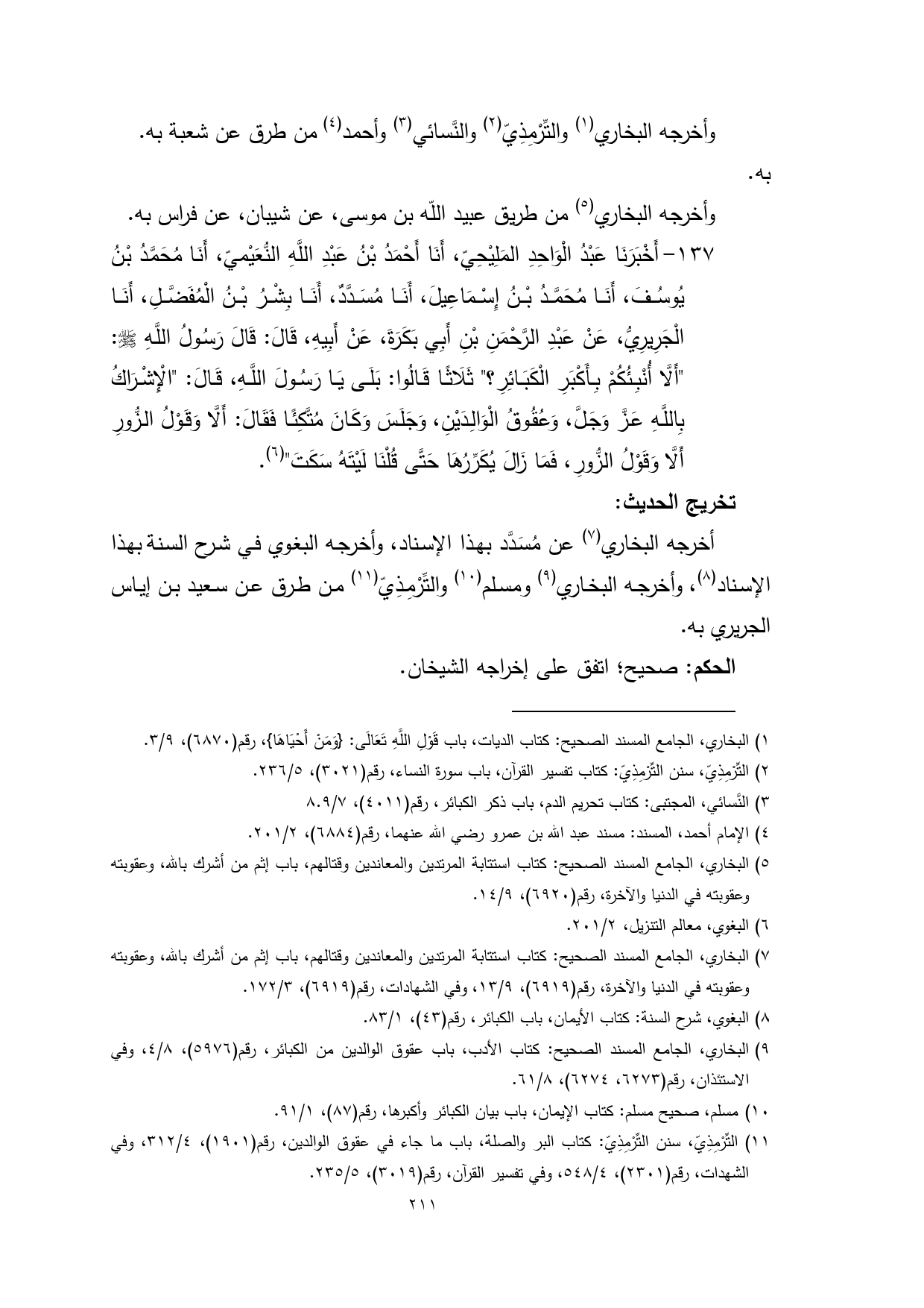 (¬9) البخاري، الجامع المسند الصحيح: كتاب الأدب، باب عقوق الوالدين من الكبائر، رقم (5976)، 8/ 4، وفي الاستئذان، رقم (6273، 6274)، 8/ 61.
