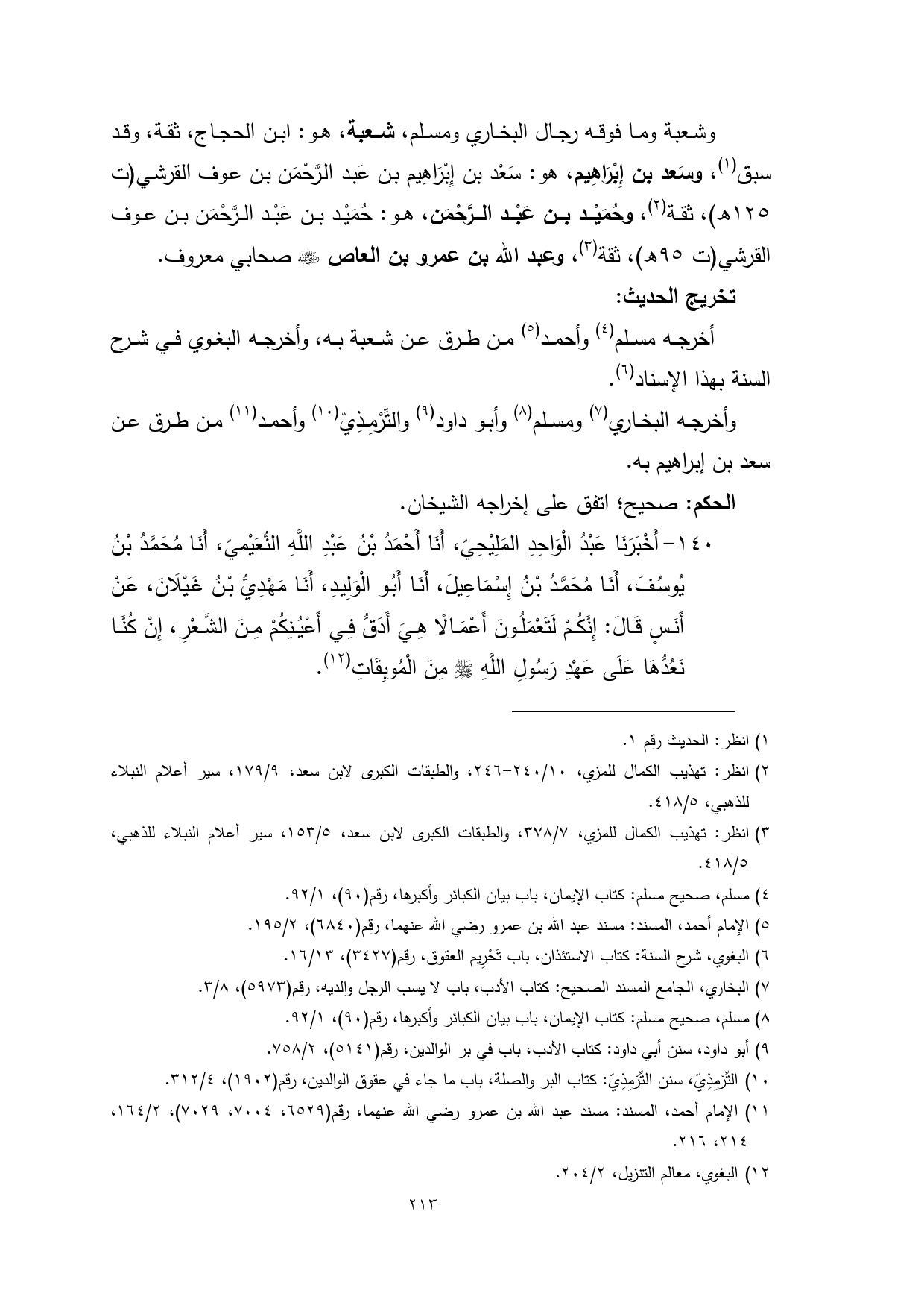 وشعبة وما فوقه رجال البخاري ومسلم، شعبة، هو: ابن الحجاج، ثقة، وقد سبق (¬1)، وسَعد بن إِبْرَاهِيم، هو: سَعْد بن إِبْرَاهِيم بن عَبد الرَّحْمَن بن عوف القرشي (ت 125 هـ)، ثقة (¬2)، وحُمَيْد بن عَبْد الرَّحْمَن، هو: حُمَيْد بن عَبْد الرَّحْمَن بن عوف القرشي (ت 95 هـ)، ثقة (¬3)، وعبد الله بن عمرو بن العاص - رضي الله عنه - صحابي معروف.