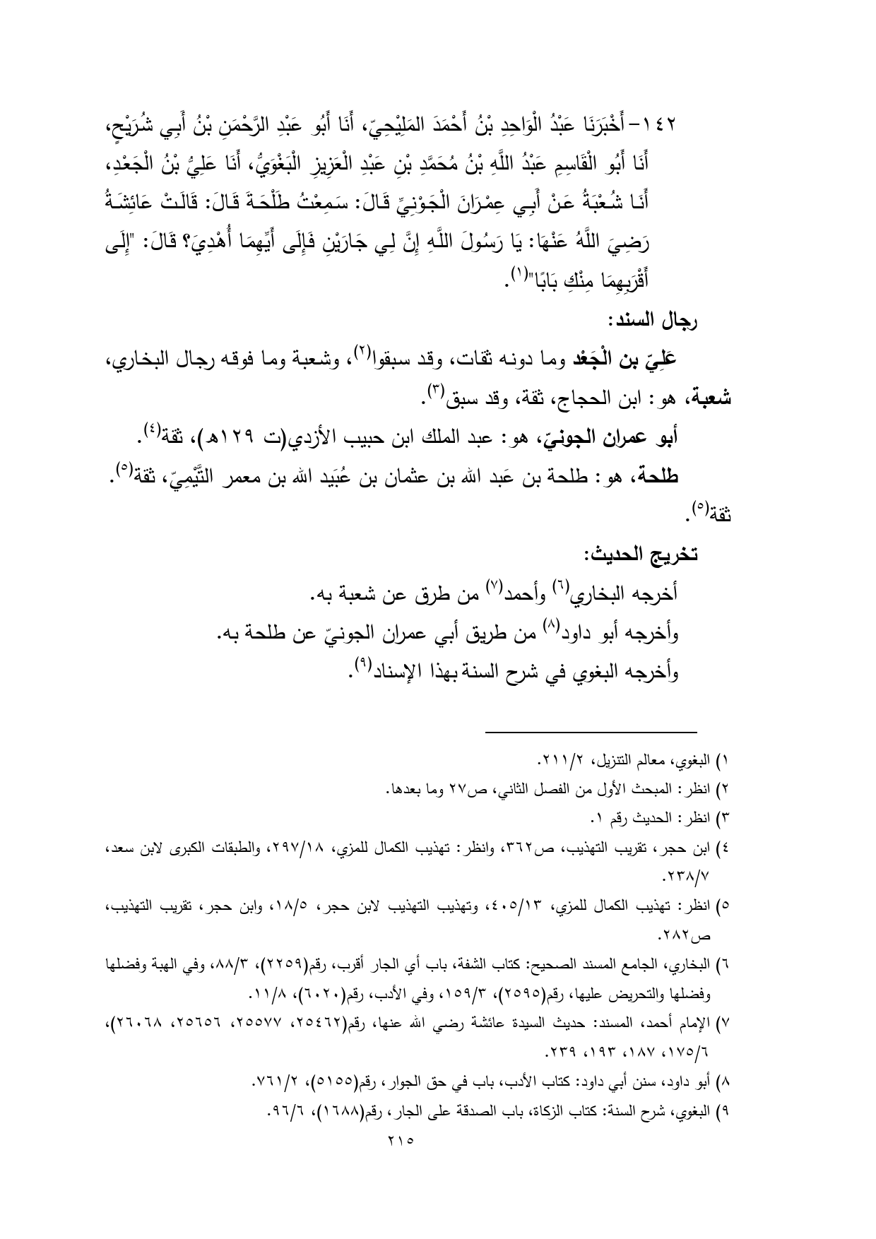 142 - أَخْبَرَنَا عَبْدُ الْوَاحِدِ بْنُ أَحْمَدَ المَلِيْحِيّ، أَنَا أَبُو عَبْدِ الرَّحْمَنِ بْنُ أَبِي شُرَيْحٍ، أَنَا أَبُو الْقَاسِمِ عَبْدُ اللَّهِ بْنُ مُحَمَّدِ بْنِ عَبْدِ الْعَزِيزِ الْبَغْوَيُّ، أَنَا عَلِيُّ بْنُ الْجَعْدِ، أَنَا شُعْبَةُ عَنْ أَبِي عِمْرَانَ الْجَوْنِيِّ قَالَ: سَمِعْتُ طَلْحَةَ قَالَ: قَالَتْ عَائِشَةُ رَضِيَ اللَّهُ عَنْهَا: يَا رَسُولَ اللَّهِ إِنَّ لِي جَارَيْنِ فَإِلَى أَيِّهِمَا أُهْدِيَ؟ قَالَ: "إِلَى أَقْرَبِهِمَا مِنْكِ بَابًا" (¬1).