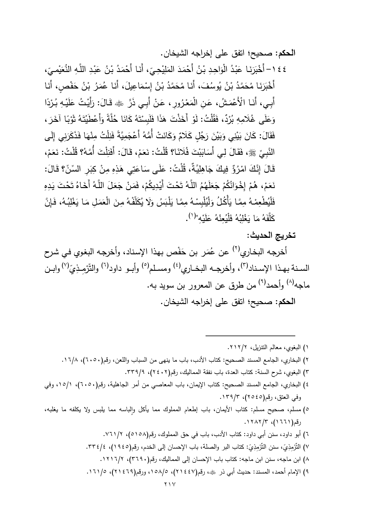 144 - أَخْبَرَنَا عَبْدُ الْوَاحِدِ بْنُ أَحْمَدَ المَلِيْحِيّ، أَنَا أَحْمَدُ بْنُ عَبْدِ اللَّهِ النُّعَيْميّ، أَخْبَرَنَا مُحَمَّدُ بْنُ يُوسُفَ، أَنَا مُحَمَّدُ بْنُ إِسْمَاعِيلَ، أَنَا عُمَرُ بْنُ حَفْصٍ، أَنَا أَبِي، أَنَا الْأَعْمَشُ، عَنِ الْمَعْرُورِ، عَنْ أَبِي ذَرٍّ - رضي الله عنه - قَالَ: رَأَيْتُ عَلَيْهِ بُرْدًا وَعَلَى غُلَامِهِ بُرْدٌ، فَقُلْتُ: لَوْ أَخَذْتَ هَذَا فَلَبِسْتَهُ كَانَا حُلَّةً وَأَعْطَيْتَهُ ثَوْبًا آخَرَ، فَقَالَ: كَانَ بَيْنِي وَبَيْنَ رَجُلٍ كَلَامٌ وَكَانَتْ أُمُّهُ أَعْجَمِيَّةً فَنِلْتُ مِنْهَا فَذَكَرَنِي إِلَى النَّبِيِّ - صلى الله عليه وسلم -، فَقَالَ لِي أَسَابَبْتَ فُلَانًا؟ قُلْتُ: نَعَمْ، قَالَ: أَفَنِلْتَ أُمَّهُ؟ قُلْتُ: نَعَمْ، قَالَ إِنَّكَ امْرُؤٌ فِيكَ جَاهِلِيَّةٌ، قُلْتُ: عَلَى سَاعَتِي هَذِهِ مِنْ كِبَرِ السِّنِّ؟ قَالَ: نَعَمْ، هُمْ إِخْوَانُكُمْ جَعَلَهُمُ اللَّهُ تَحْتَ أَيْدِيكُمْ، فَمَنْ جَعَلَ اللَّهُ أَخَاهُ تَحْتَ يَدِهِ فَلْيُطْعِمْهُ مِمَّا يَأْكُلُ وَلْيُلْبِسْهُ مِمَّا يَلْبَسُ وَلَا يُكَلِّفْهُ مِنَ الْعَمَلِ مَا يَغْلِبُهُ، فَإِنَّ كَلَّفَهُ مَا يَغْلِبُهُ فَلْيُعِنْهُ عَلَيْهِ" (¬1).