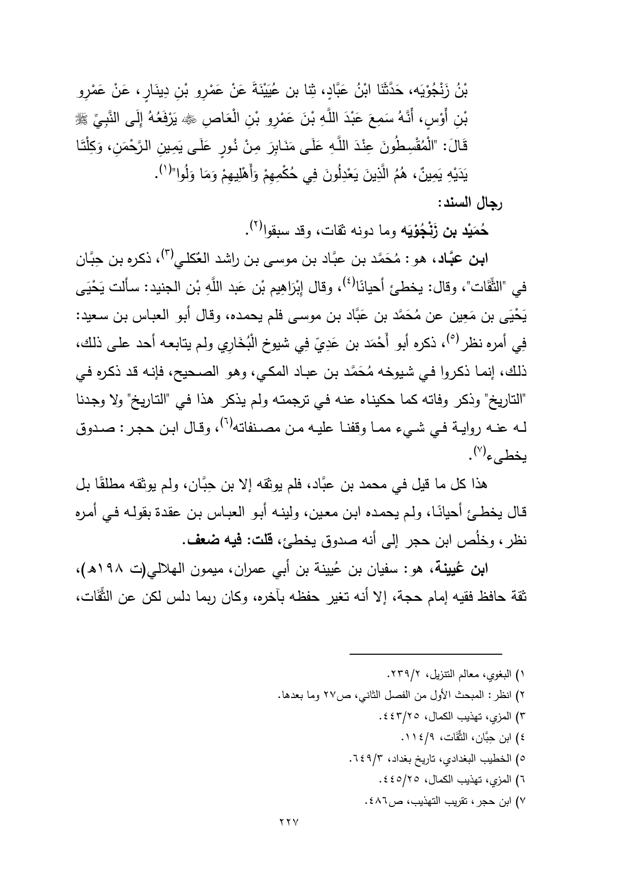 بْنُ زَنْجُوْيَه، حَدَّثَنَا ابْنُ عَبَّادٍ، ثِنا بن عُيَيْنَةَ عَنْ عَمْرِو بْنِ دِينَارٍ، عَنْ عَمْرِو بْنِ أَوْسٍ، أَنَّهُ سَمِعَ عَبْدَ اللَّهِ بْنَ عَمْرِو بْنِ الْعَاصِ - رضي الله عنه - يَرْفَعُهُ إِلَى النَّبِيِّ - صلى الله عليه وسلم - قَالَ: "الْمُقْسِطُونَ عِنْدَ اللَّهِ عَلَى مَنَابِرَ مِنْ نُورٍ عَلَى يَمِينِ الرَّحْمَنِ، وَكِلْتَا يَدَيْهِ يَمِينٌ، هُمُ الَّذِينَ يَعْدِلُونَ فِي حُكْمِهِمْ وَأَهْلِيهِمْ وَمَا وَلُوا" (¬1).