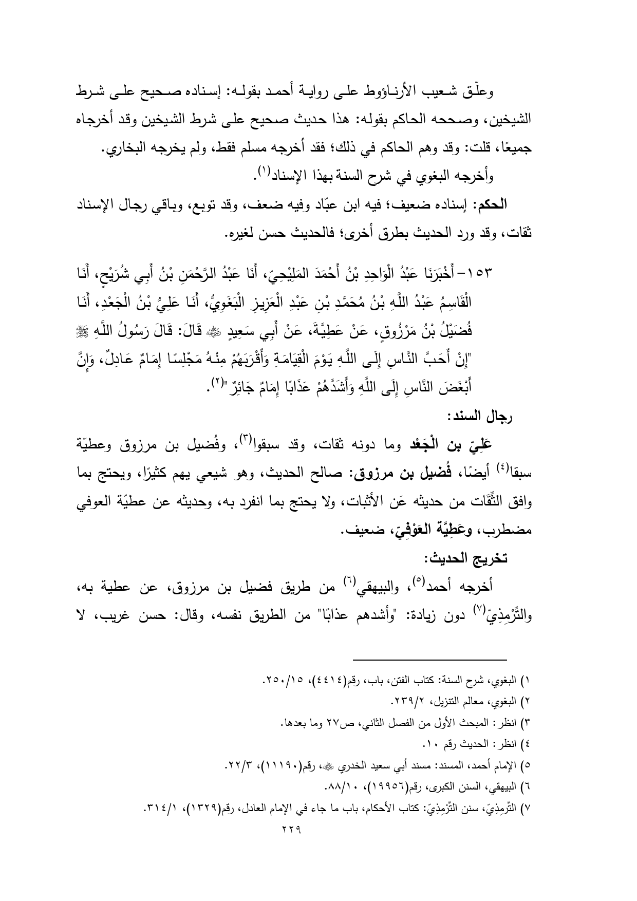 عَلِيّ بن الْجَعْد وما دونه ثقات، وقد سبقوا (¬3)، وفُضيل بن مرزوق وعطيّة سبقا (¬4) أيضًا، فُضيل بن مرزوق: صالح الحديث، وهو شيعي يهم كثيرًا، ويحتج بما وافق الثِّقَات من حديثه عَن الأثبات، ولا يحتج بما انفرد به، وحديثه عن عطيّة العوفي مضطرب، وعَطِيَّة العَوْفِيّ، ضعيف.