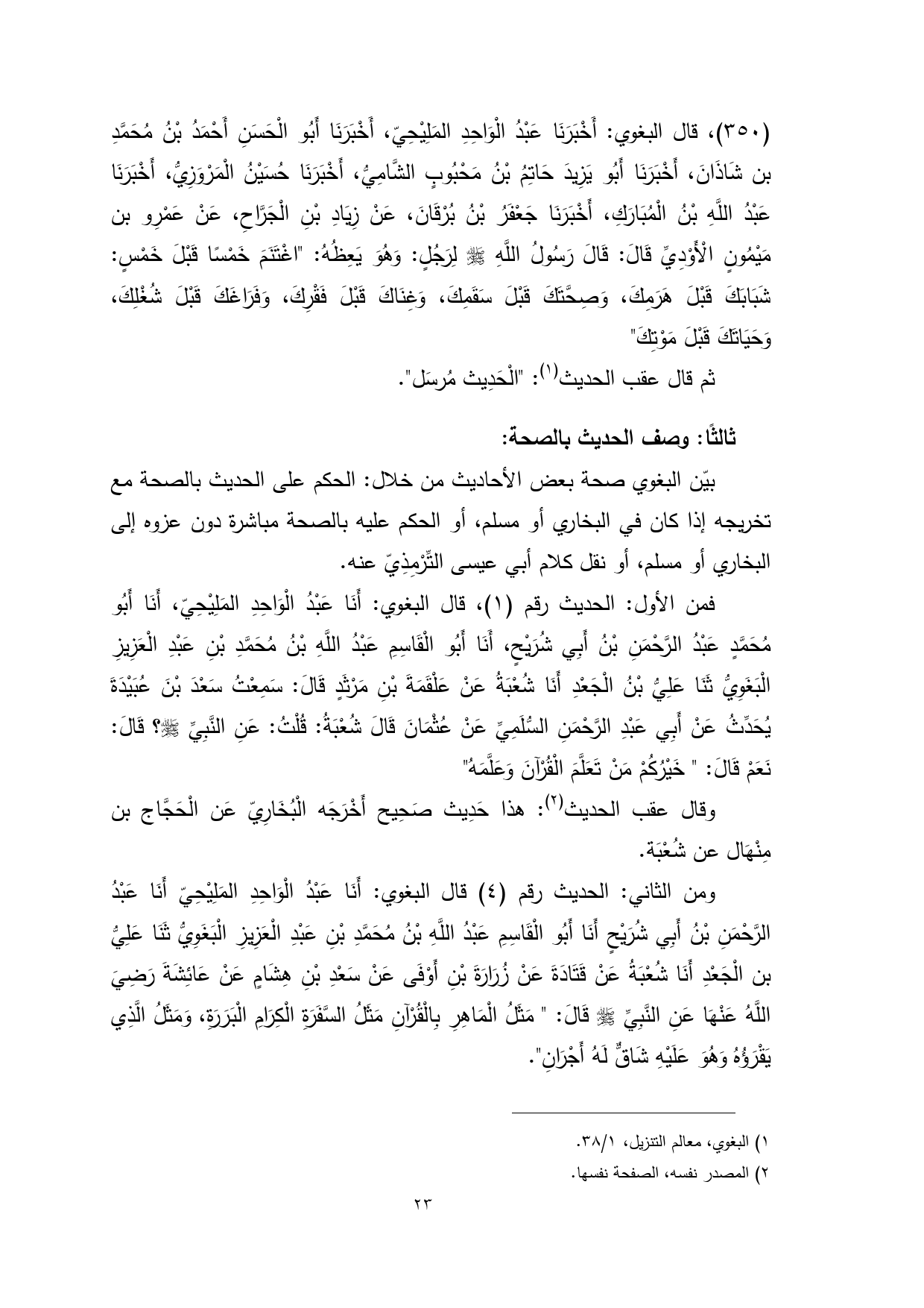 فمن الأول: الحديث رقم (1)، قال البغوي: أَنَا عَبْدُ الْوَاحِدِ المَلِيْحِيّ، أَنَا أَبُو مُحَمَّدٍ عَبْدُ الرَّحْمَنِ بْنُ أَبِي شُرَيْحٍ، أَنَا أَبُو الْقَاسِمِ عَبْدُ اللَّهِ بْنُ مُحَمَّدِ بْنِ عَبْدِ الْعَزِيزِ الْبَغَوِيُّ ثَنَا عَلِيُّ بْنُ الْجَعْدِ أَنَا شُعْبَةُ عَنْ عَلْقَمَةَ بْنِ مَرْثَدٍ قَالَ: سَمِعْتُ سَعْدَ بْنَ عُبَيْدَةَ يُحَدِّثُ عَنْ أَبِي عَبْدِ الرَّحْمَنِ السُّلَمِيِّ عَنْ عُثْمَانَ قَالَ شُعْبَةُ: قُلْتُ: عَنِ النَّبِيِّ - صلى الله عليه وسلم -؟ قَالَ: نَعَمْ قَالَ: " خَيْرُكُمْ مَنْ تَعَلَّمَ الْقُرْآنَ وَعَلَّمَهُ"