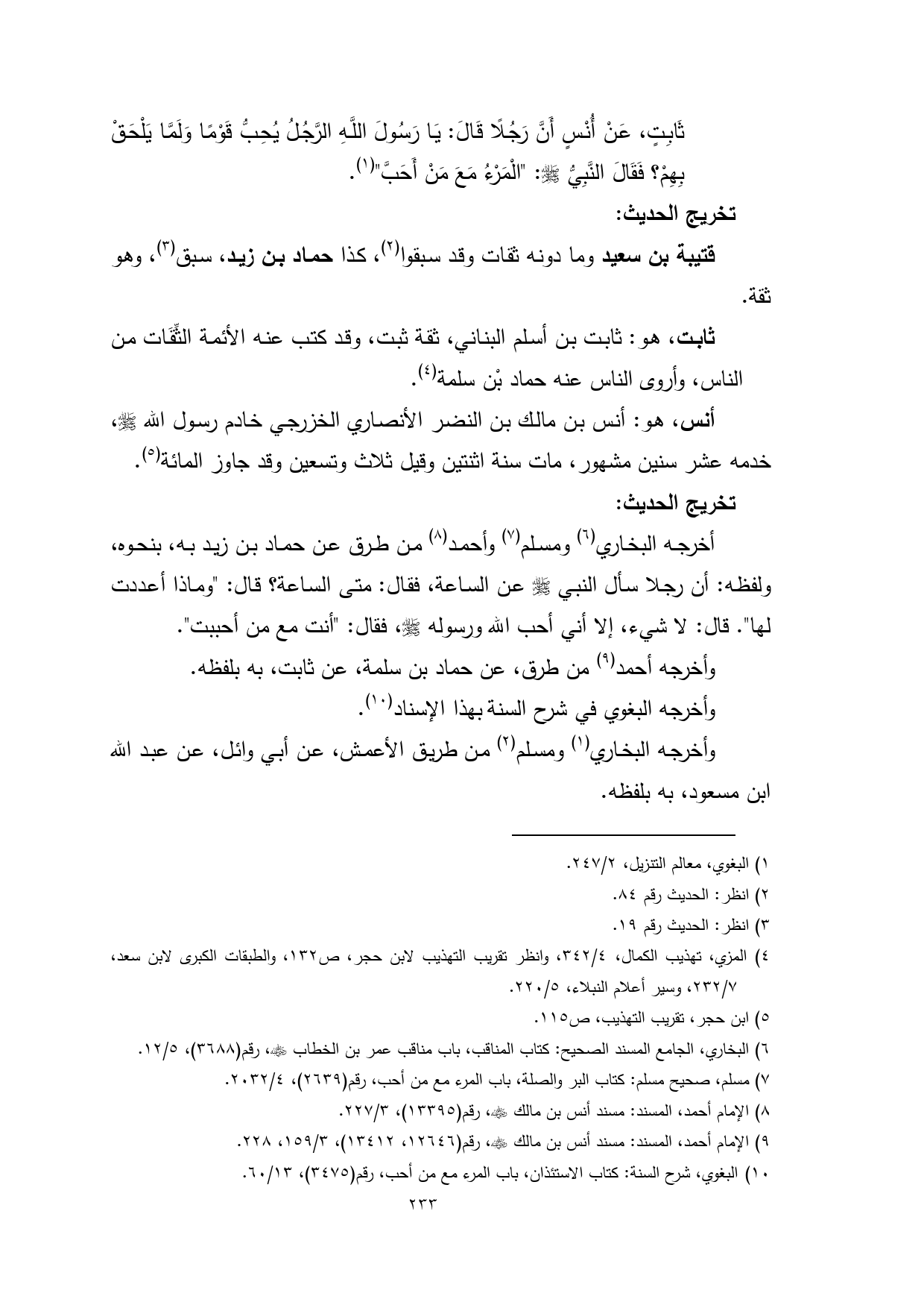 (¬10) البغوي، شرح السنة: كتاب الاستئذان، باب المرء مع من أحب، رقم (3475)، 13/ 60.