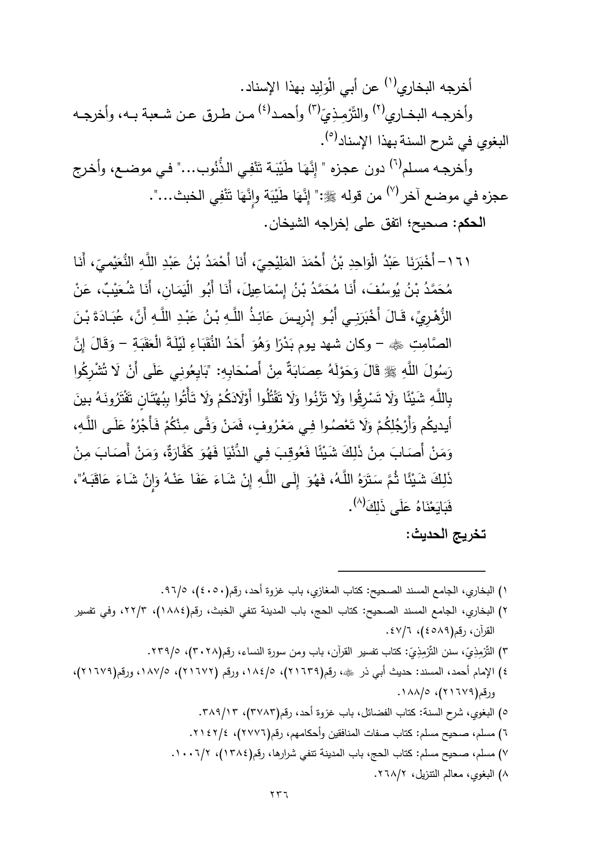 161 - أَخْبَرَنَا عَبْدُ الْوَاحِدِ بْنُ أَحْمَدَ المَلِيْحِيّ، أَنَا أَحْمَدُ بْنُ عَبْدِ اللَّهِ النُّعَيْميّ، أَنَا مُحَمَّدُ بْنُ يُوسُفَ، أَنَا مُحَمَّدُ بْنُ إِسْمَاعِيلَ، أَنَا أَبُو الْيَمَانِ، أَنَا شُعَيْبٌ، عَنْ الزُّهْرِيِّ، قَالَ أَخْبَرَنِي أَبُو إِدْرِيسَ عَائِذُ اللَّهِ بْنُ عَبْدِ اللَّهِ أَنَّ، عُبَادَةَ بْنَ الصَّامِتِ - رضي الله عنه - وكان شهد يوم بَدْرًا وَهُوَ أَحَدُ النُّقَبَاءِ لَيْلَةَ الْعَقَبَةِ - وَقَالَ إِنَّ رَسُولَ اللَّهِ - صلى الله عليه وسلم - قَالَ وَحَوْلَهُ عِصَابَةٌ مِنْ أَصْحَابِهِ: "بَايِعُونِي عَلَى أَنْ لَا تُشْرِكُوا بِاللَّهِ شَيْئًا وَلَا تَسْرِقُوا وَلَا تَزْنُوا وَلَا تَقْتُلُوا أَوْلَادَكُمْ وَلَا تَأْتُوا بِبُهْتَانٍ تَفْتَرُونَهُ بينَ أيديكُم وَأَرْجُلِكُمْ وَلَا تَعْصُوا فِي مَعْرُوفٍ، فَمَنْ وَفَّى مِنْكُمْ فَأَجْرُهُ عَلَى اللَّهِ، وَمَنْ أَصَابَ مِنْ ذَلِكَ شَيْئًا فَعُوقِبَ فِي الدُّنْيَا فَهُوَ كَفَّارَةٌ، وَمَنْ أَصَابَ مِنْ ذَلِكَ شَيْئًا ثُمَّ سَتَرَهُ اللَّهُ، فَهُوَ إِلَى اللَّهِ إِنْ شَاءَ عَفَا عَنْهُ وَإِنْ شَاءَ عَاقَبَهُ"، فَبَايَعْنَاهُ عَلَى ذَلِكَ (¬8).