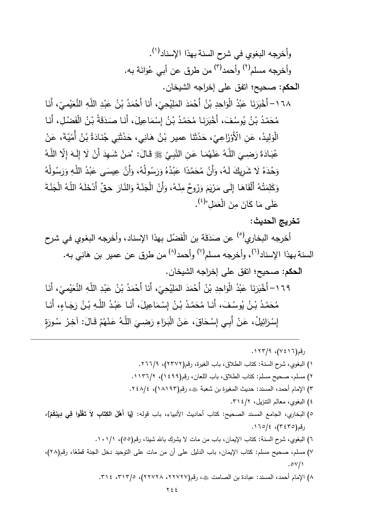 168 - أَخْبَرَنَا عَبْدُ الْوَاحِدِ بْنُ أَحْمَدَ المَلِيْحِيّ، أَنَا أَحْمَدُ بْنُ عَبْدِ اللَّهِ النُّعَيْميّ، أَنَا مُحَمَّدُ بْنُ يُوسُفَ، أَخْبَرَنَا مُحَمَّدُ بْنُ إِسْمَاعِيلَ، أَنَا صَدَقَةُ بْنُ الْفَضْلِ، أَنَا الْوَلِيدُ، عَنِ الْأَوْزَاعِيِّ، حَدَّثَنَا عمير بْنُ هَانِي، حَدَّثَنِي جُنَادَةُ بْنُ أُمِّيَّةَ، عَنْ عُبَادَةَ رَضِيَ اللَّهُ عَنْهُمَا عَنِ النَّبِيِّ - صلى الله عليه وسلم - قَالَ: "مَنْ شَهِدَ أَنْ لَا إِلَهَ إِلَّا اللَّهُ وَحْدَهُ لَا شَرِيكَ لَهُ، وَأَنَّ مُحَمَّدًا عَبْدُهُ وَرَسُولُهُ، وَأَنَّ عِيسَى عَبْدُ اللَّهِ وَرَسُولُهُ وَكَلِمَتُهُ أَلْقَاهَا إِلَى مَرْيَمَ وَرُوحٌ مِنْهُ، وَأَنَّ الْجَنَّةَ وَالنَّارَ حقٌ أَدْخَلَهُ اللَّهُ الْجَنَّةَ عَلَى مَا كَانَ مِنَ الْعَمَلِ" (¬4).