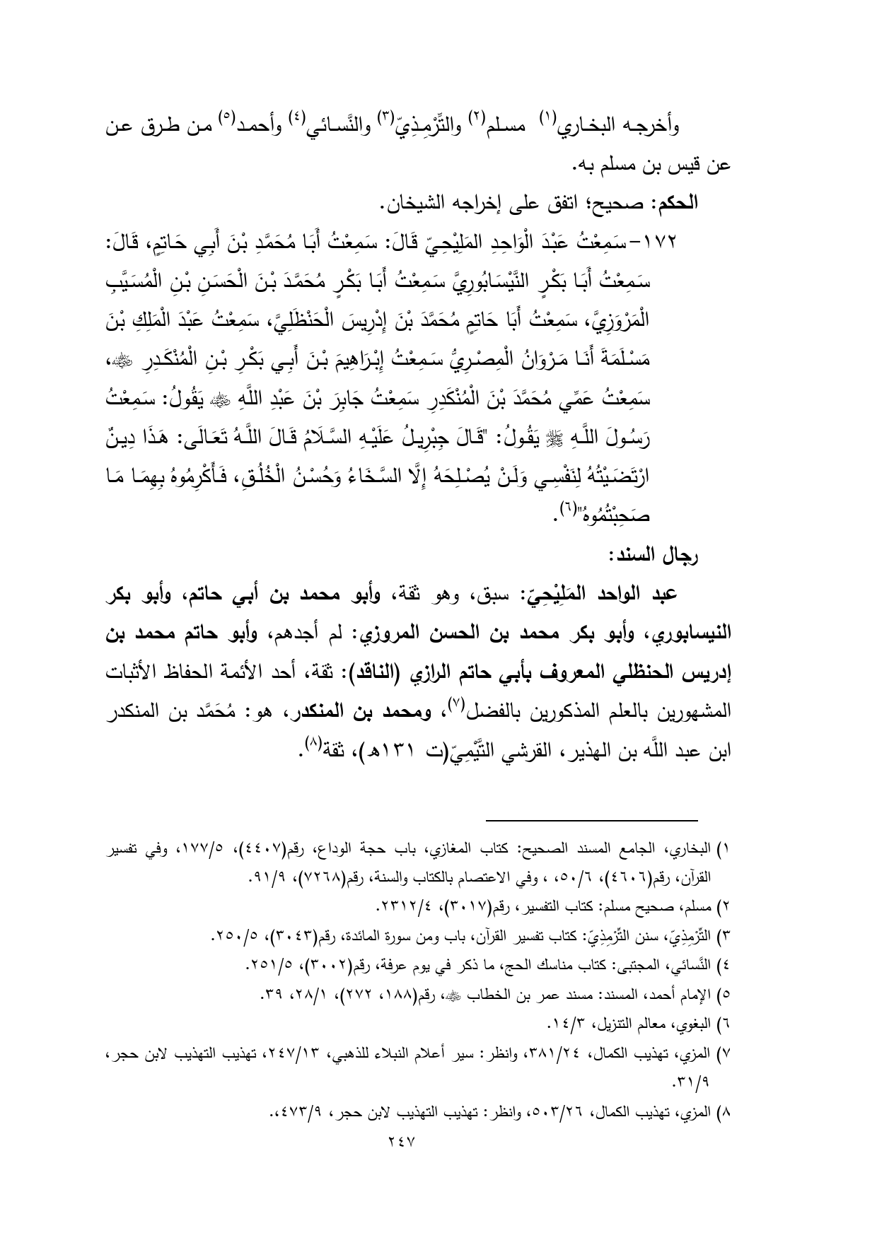 172 - سَمِعْتُ عَبْدَ الْوَاحِدِ المَلِيْحِيّ قَالَ: سَمِعْتُ أَبَا مُحَمَّدِ بْنَ أَبِي حَاتِمٍ، قَالَ: سَمِعْتُ أَبَا بَكْرٍ النَّيْسَابُورِيَّ سَمِعْتُ أَبَا بَكْرٍ مُحَمَّدَ بْنَ الْحَسَنِ بْنِ الْمُسَيَّبِ الْمَرْوَزِيَّ، سَمِعْتُ أَبَا حَاتِمٍ مُحَمَّدَ بْنَ إِدْرِيسَ الْحَنْظَلِيَّ، سَمِعْتُ عَبْدَ الْمَلِكِ بْنَ مَسْلَمَةَ أَنَا مَرْوَانُ الْمِصْرِيُّ سَمِعْتُ إِبْرَاهِيمَ بْنَ أَبِي بَكْرِ بْنِ الْمُنْكَدِرِ - رضي الله عنه -، سَمِعْتُ عَمِّي مُحَمَّدَ بْنَ الْمُنْكَدِرِ سَمِعْتُ جَابِرَ بْنَ عَبْدِ اللَّهِ - رضي الله عنه - يَقُولُ: سَمِعْتُ رَسُولَ اللَّهِ - صلى الله عليه وسلم - يَقُولُ: "قَالَ جِبْرِيلُ عَلَيْهِ السَّلَامُ قَالَ اللَّهُ تَعَالَى: هَذَا دِينٌ ارْتَضَيْتُهُ لِنَفْسِي وَلَنْ يُصْلِحَهُ إِلَّا السَّخَاءُ وَحُسْنُ الْخُلُقِ، فَأَكْرِمُوهُ بِهِمَا مَا صَحِبْتُمُوهُ" (¬6).