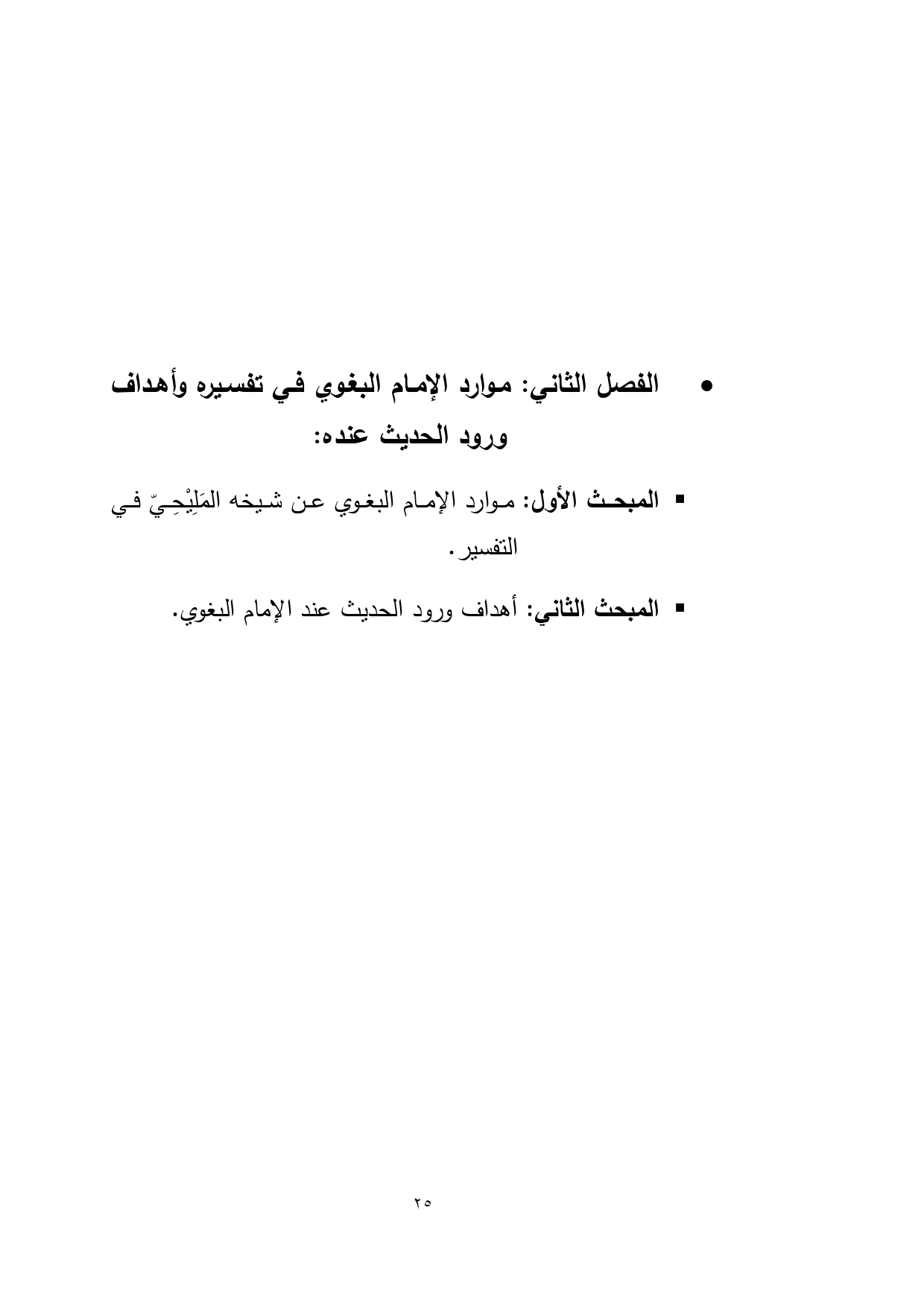 - الفصل الثاني: موارد الإمام البغوي في تفسيره وأهداف ورود الحديث عنده: