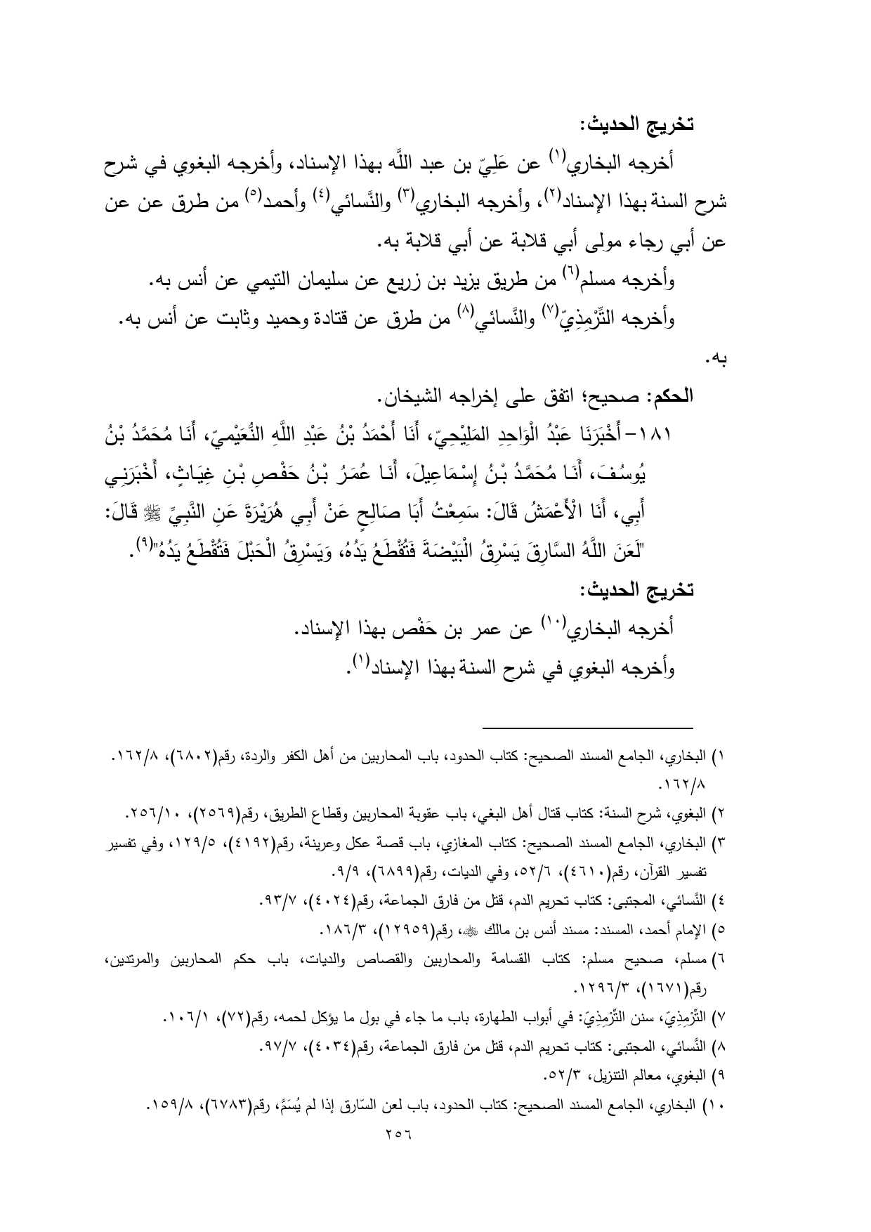 (¬11) البغوي، شرح السنة: كتاب الحدود، باب قطع يد السّارق وما يقطع فيه يده، رقم (2597)، 10/ 314.