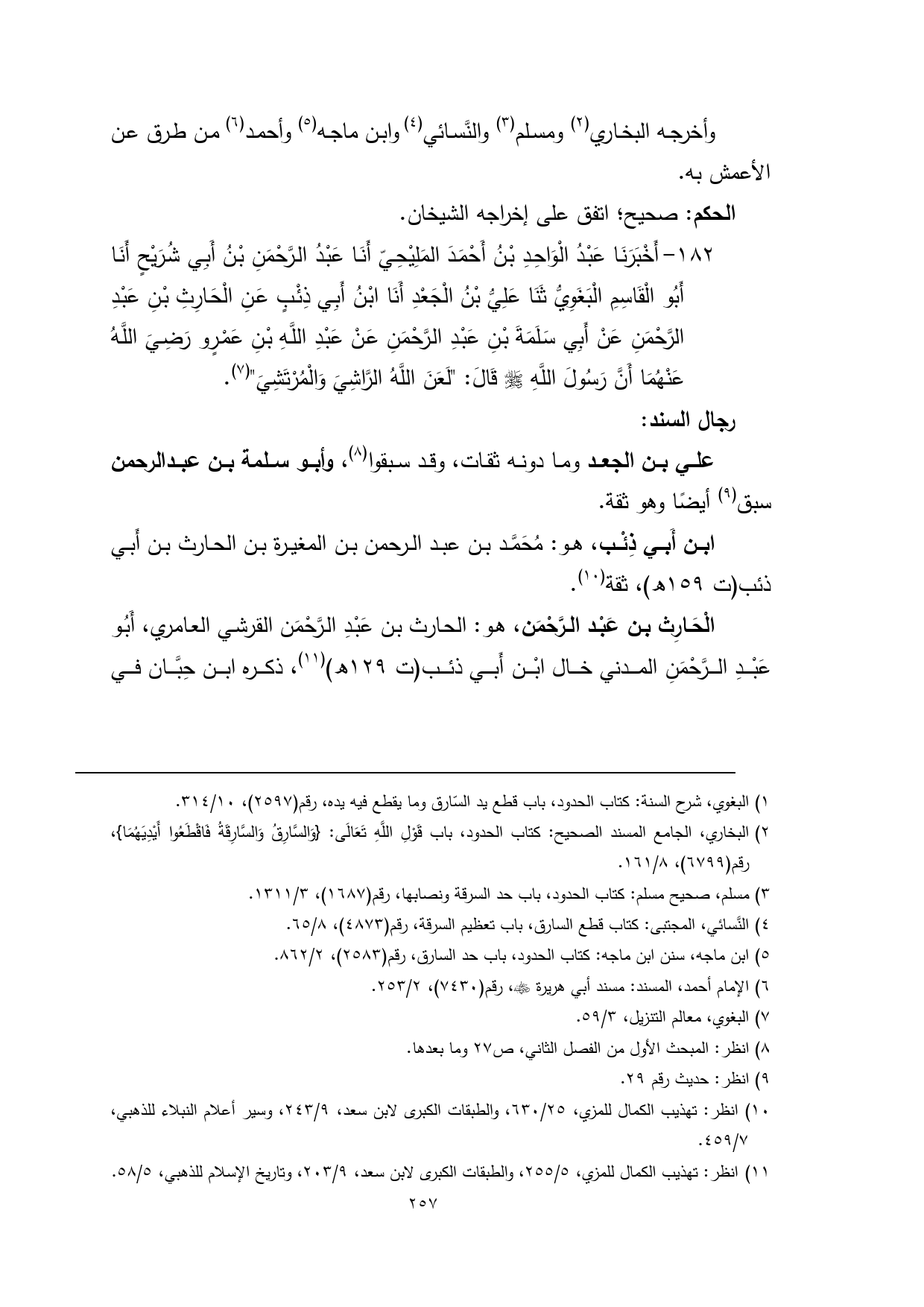 182 - أَخْبَرَنَا عَبْدُ الْوَاحِدِ بْنُ أَحْمَدَ المَلِيْحِيّ أَنَا عَبْدُ الرَّحْمَنِ بْنُ أَبِي شُرَيْحٍ أَنَا أَبُو الْقَاسِمِ الْبَغَوِيُّ ثَنَا عَلِيُّ بْنُ الْجَعْدِ أَنَا ابْنُ أَبِي ذِئْبٍ عَنِ الْحَارِثِ بْنِ عَبْدِ الرَّحْمَنِ عَنْ أَبِي سَلَمَةَ بْنِ عَبْدِ الرَّحْمَنِ عَنْ عَبْدِ اللَّهِ بْنِ عَمْرٍو رَضِيَ اللَّهُ عَنْهُمَا أَنَّ رَسُولَ اللَّهِ - صلى الله عليه وسلم - قَالَ: "لَعَنَ اللَّهُ الرَّاشِيَ وَالْمُرْتَشِيَ" (¬6).